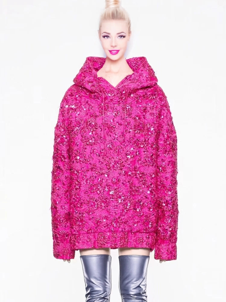 Ashore Boutique Lt Luxury Bright Fuchsia Color Sequence Hoodie Designer Tops Women's Jacquard Beaded Loose Hooded Hoodie
