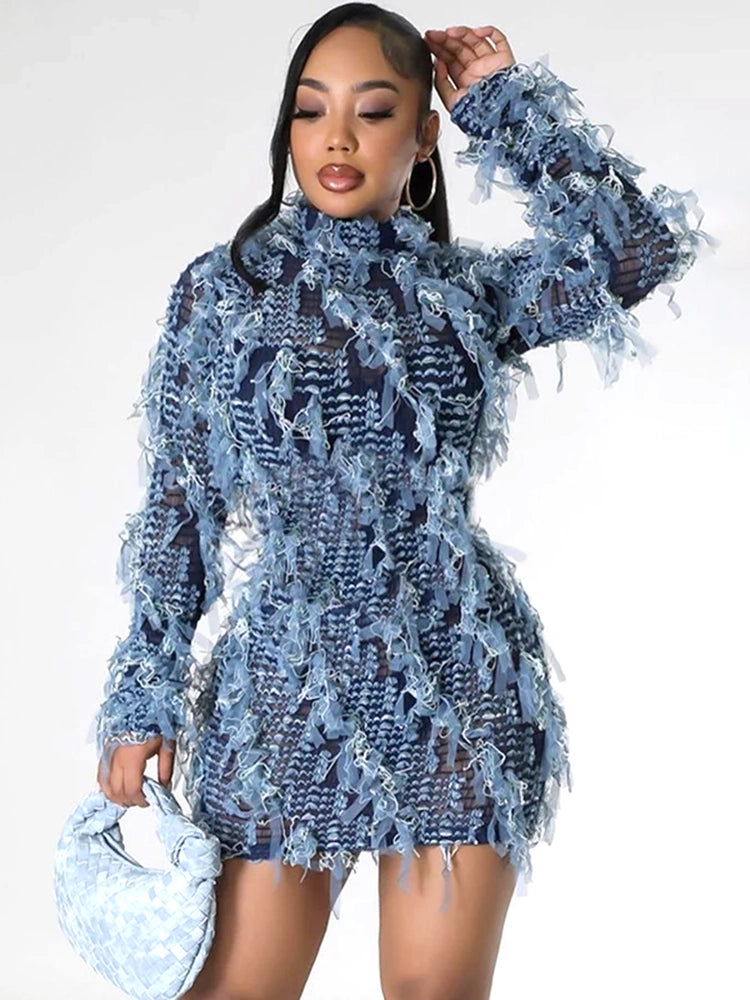 • Ashore Shop Autumn Full Sleeve Crew Neck Holes Casual Dress Tassel O-neck Long Sleeve Patchwork Mini Dress For Women
