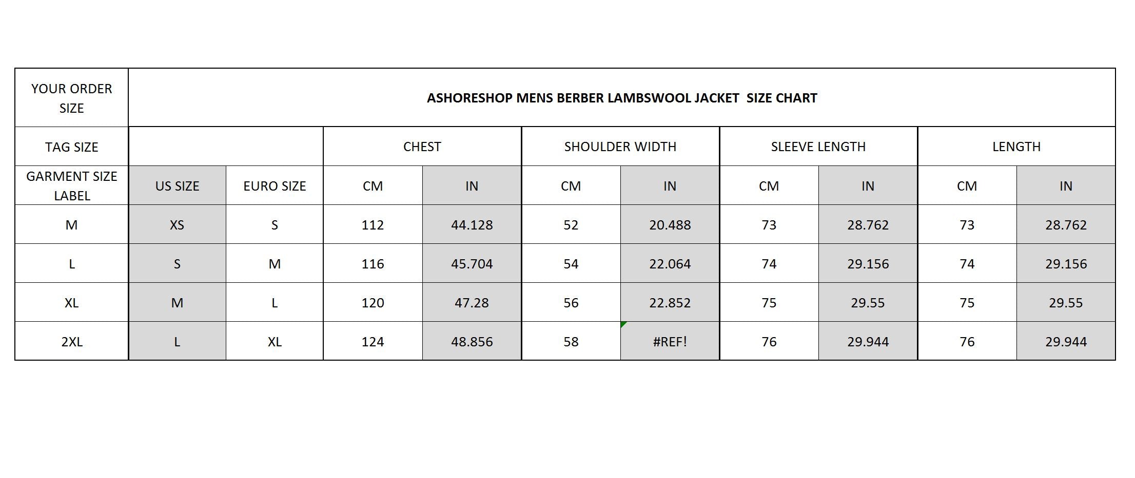 ASHORE MENS SHOP Mens Berber OUTDOOR JACKET Size Chart