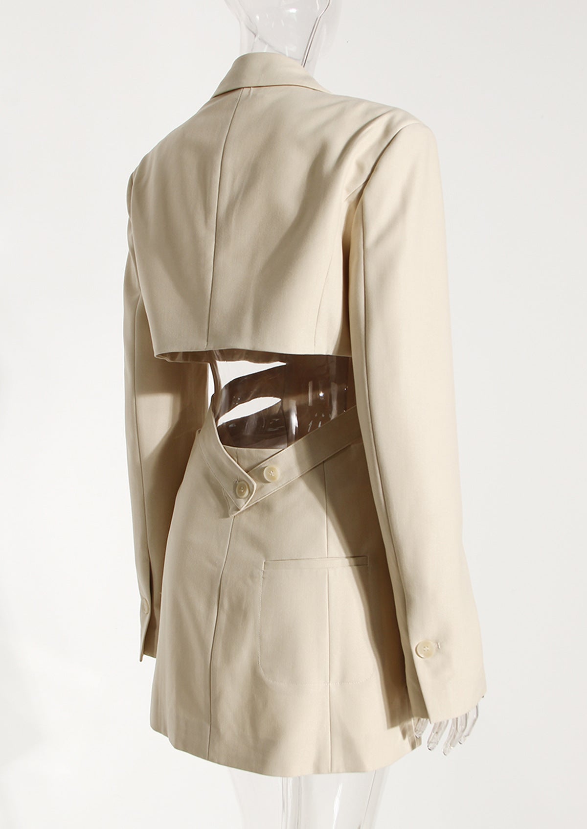 Ashore Shop summer cut-out suit dress is a contemporary, fashion-forward piece that blends the structure of a tailored blazer with the breezy elegance of a mini dress. Crafted in a light beige fabric, the dress features: