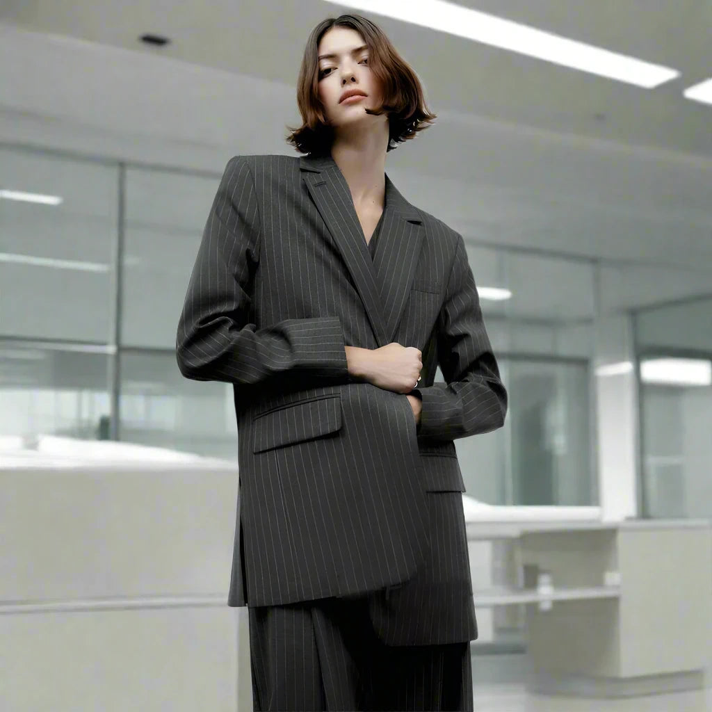Ashore Custom Shop Modern Women's Pin Stripe Blazer 3 Pcs Fashion High Street Long Sleeve Suit Jackets Vest And  Pants Suit Female Loose Formal Business Pant Sets
