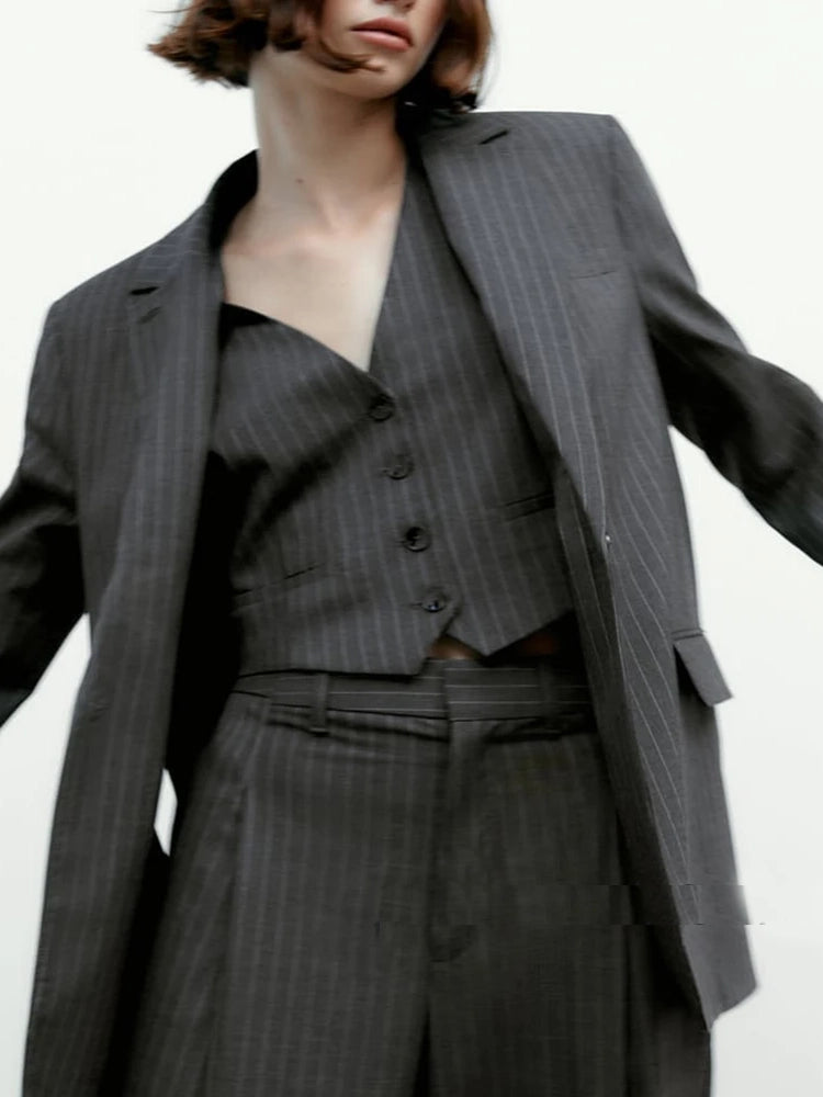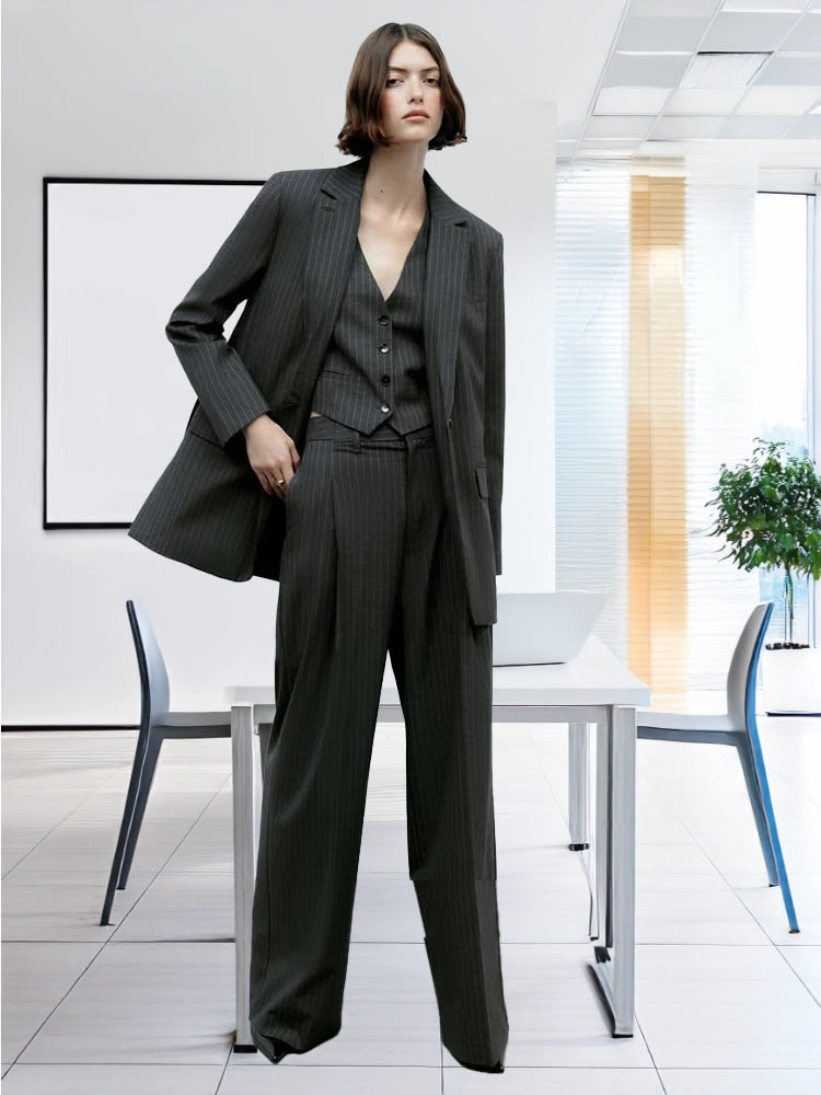 Modern Women's Pin Stripe Blazer 3 Pcs Long Sleeve Suit Jackets Vest And Pants Suit Sets