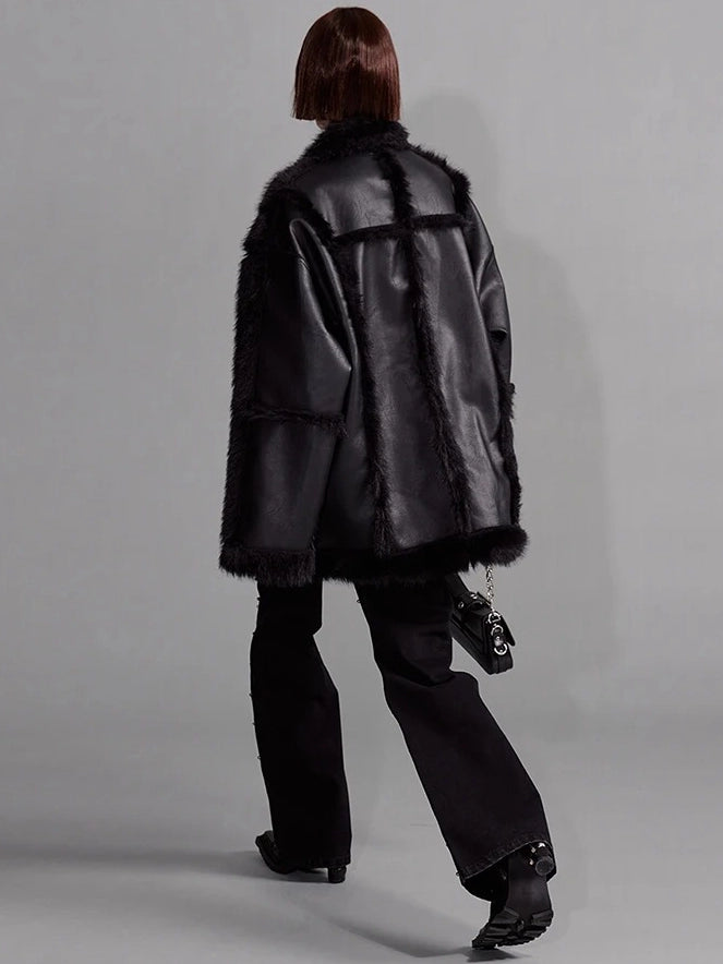 Womens Fur Faux Leather Shearling Motorcycle Oversized Jacket Coat
