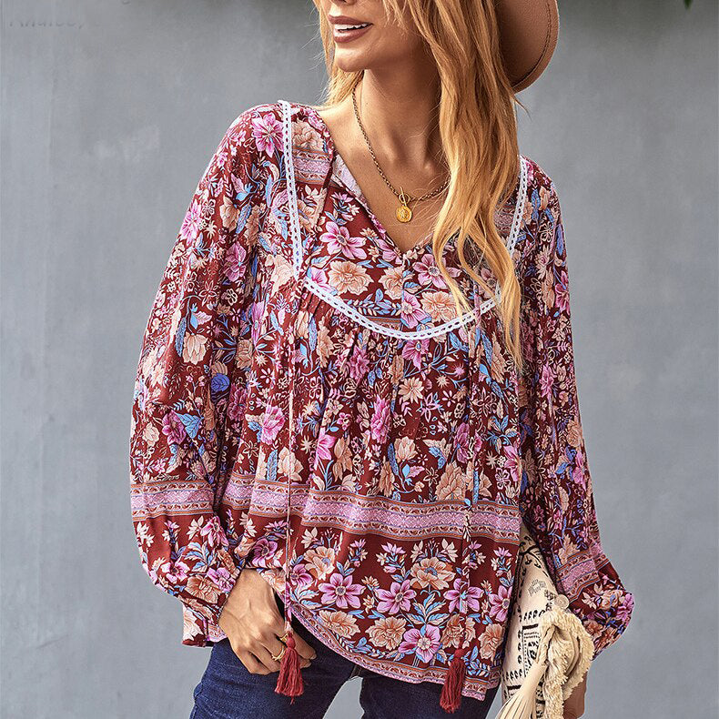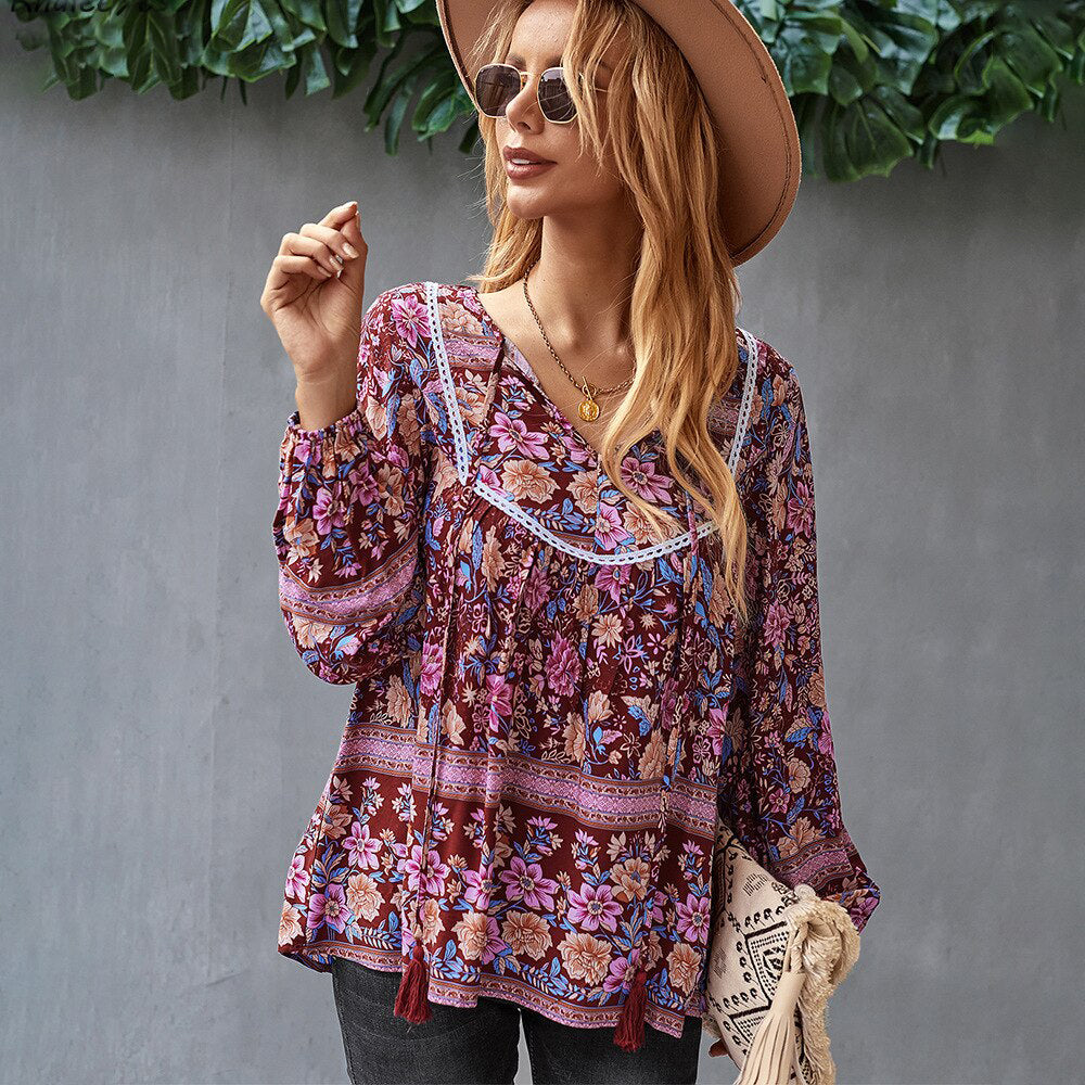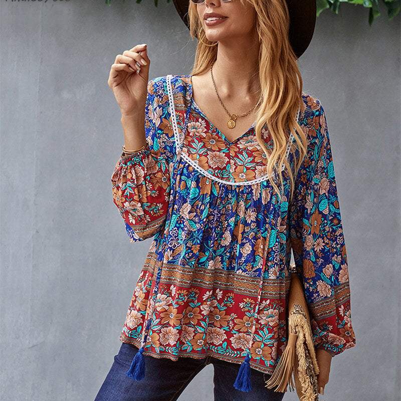 • Ashore Shop Boho Floral Printed Blouse Shirt Spring Autumn Women Blouse Tassels Vintage Chic Long Sleeve Ethnic Ladies Tops 2023