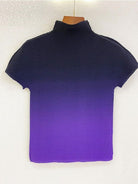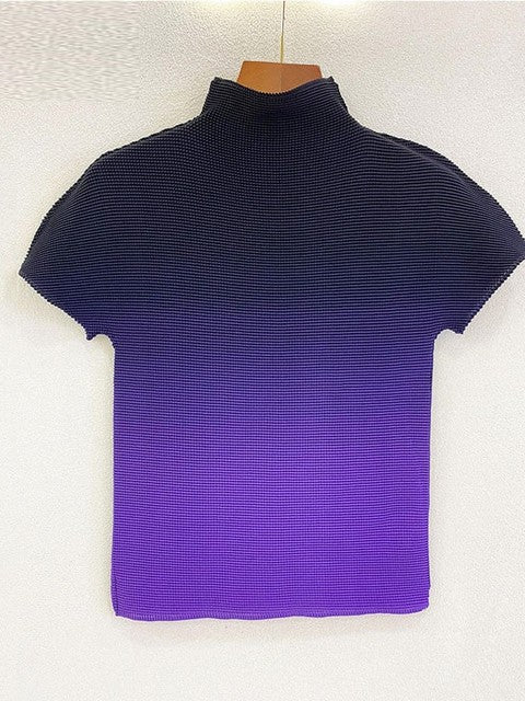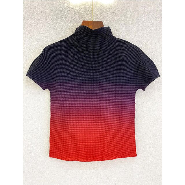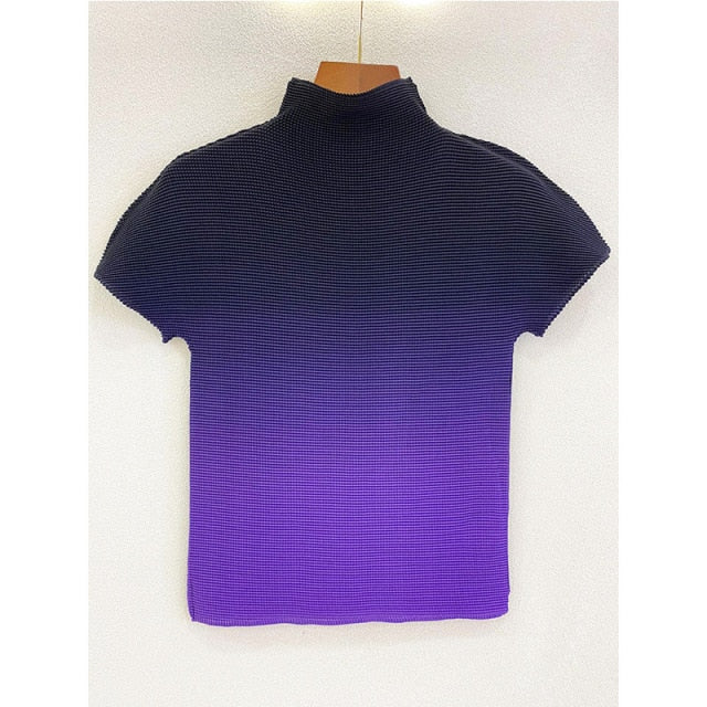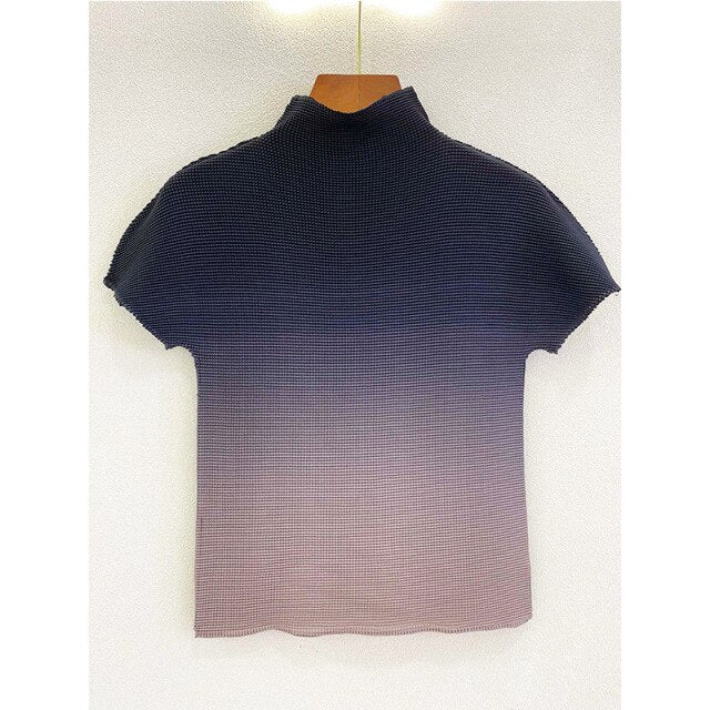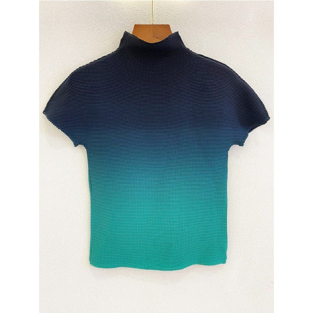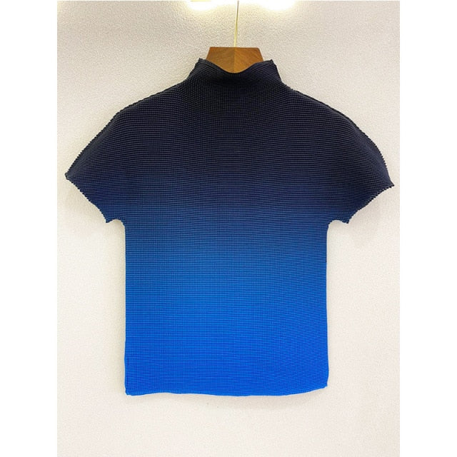 Ashore Ripple Stretch Ombre Sexy Woman T Shirts Pleated Gradient Stand Collar Short Sleeve Tee