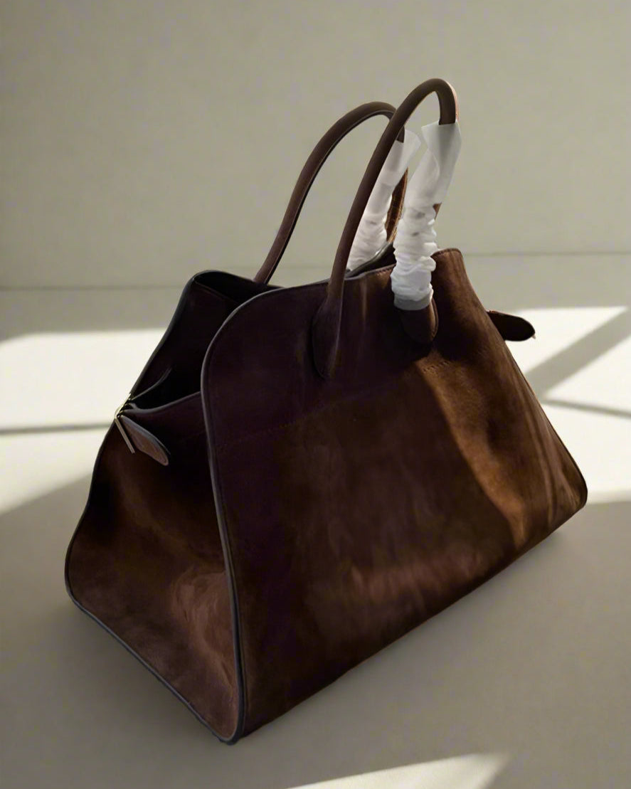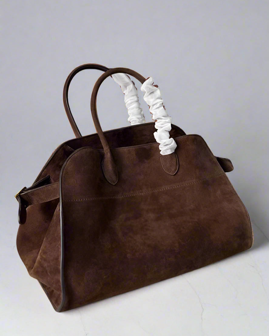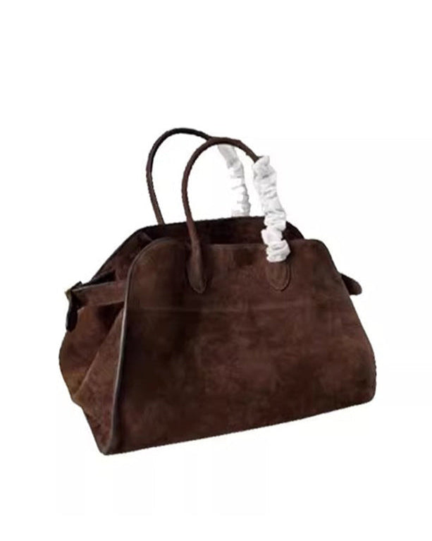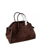 Ashoreshop Travel Bags large women's handbag made of rich, chocolate-brown suede leather, featuring a structured doctor-bag or satchel-style design with a spacious, rectangular body and subtle curved edges for a soft yet elegant silhouette. The bag measures approximately 15 inches wide and 10 inches tall (based on visual proportions), making it ideal for everyday essentials or work items.