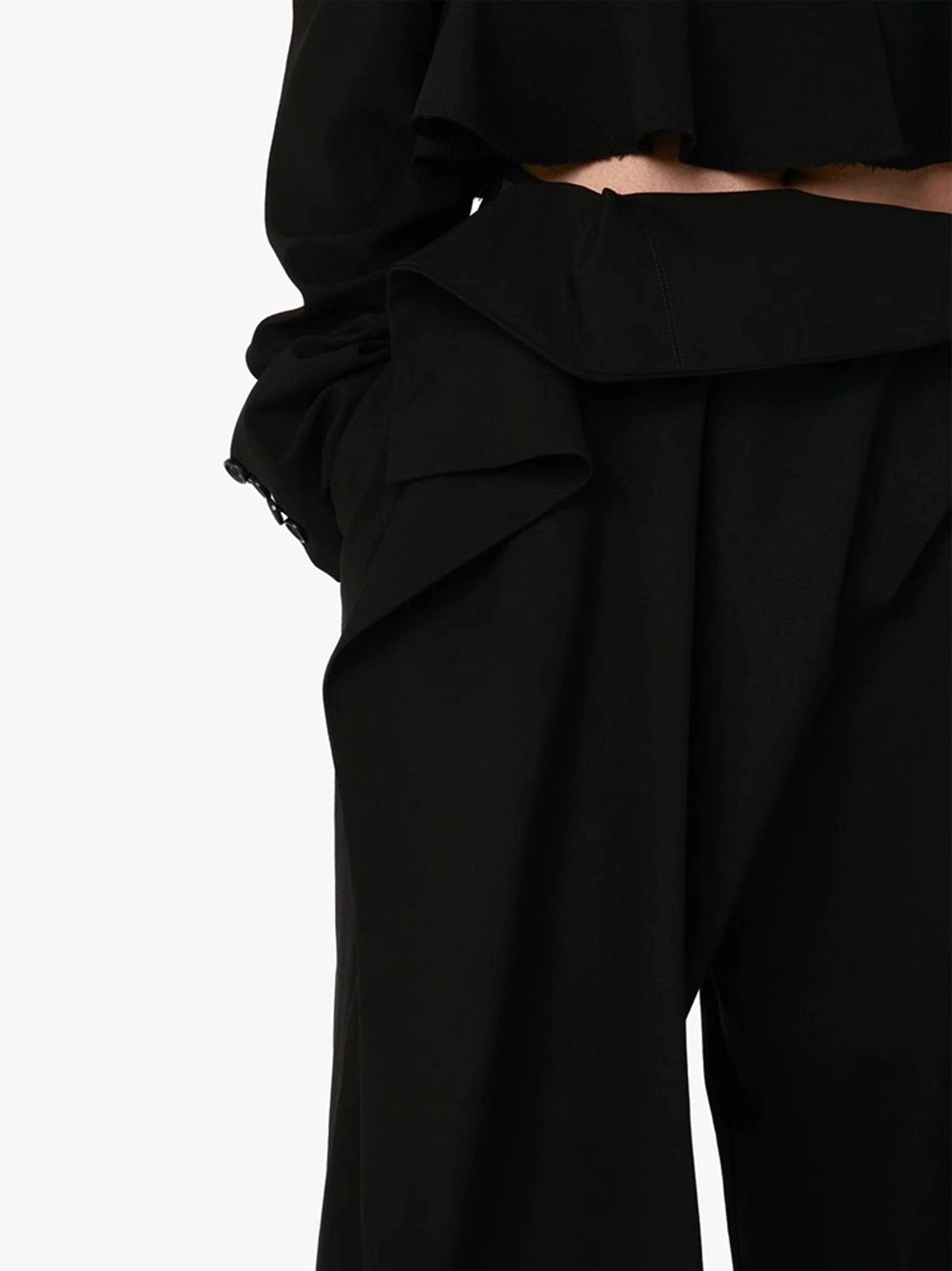 Pants: High-waisted, loose-fitting black trousers with a draped piece. The waistband is asymmetrical, folding over at the front, which creates a unique and avant-garde silhouette. The pants have a wide-leg cut that extends down to the ankles .