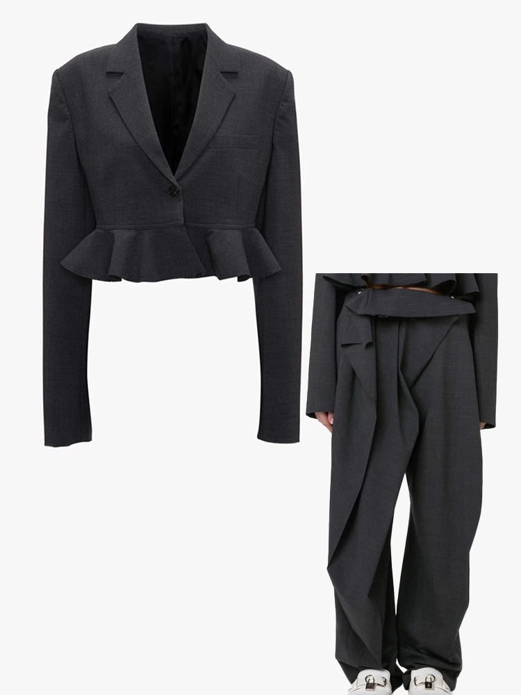 Blazer: A cropped black blazer with a single button closure. It features ruffle detailing along the hemline, adding a feminine touch. The sleeves are long with an exaggerated, slightly puffed appearance, contributing to a bold and structured look.