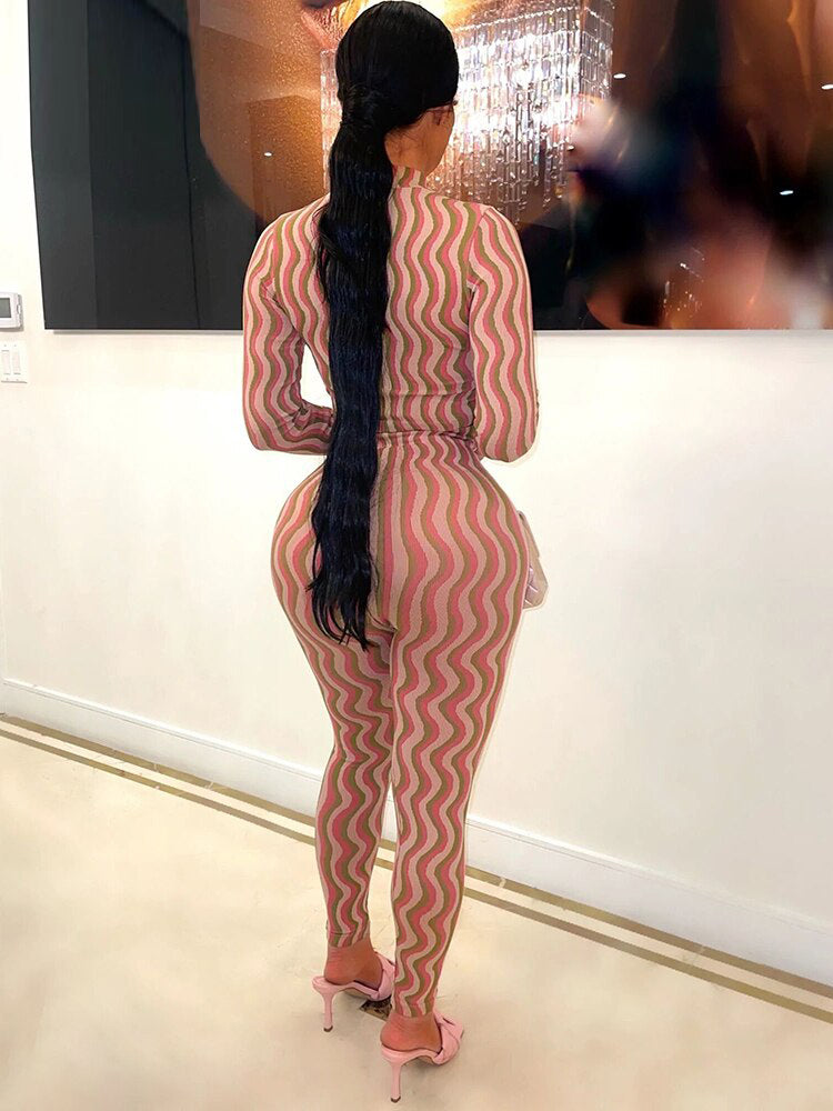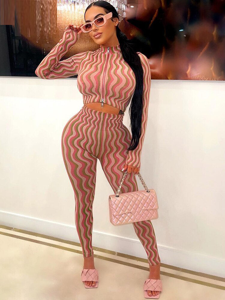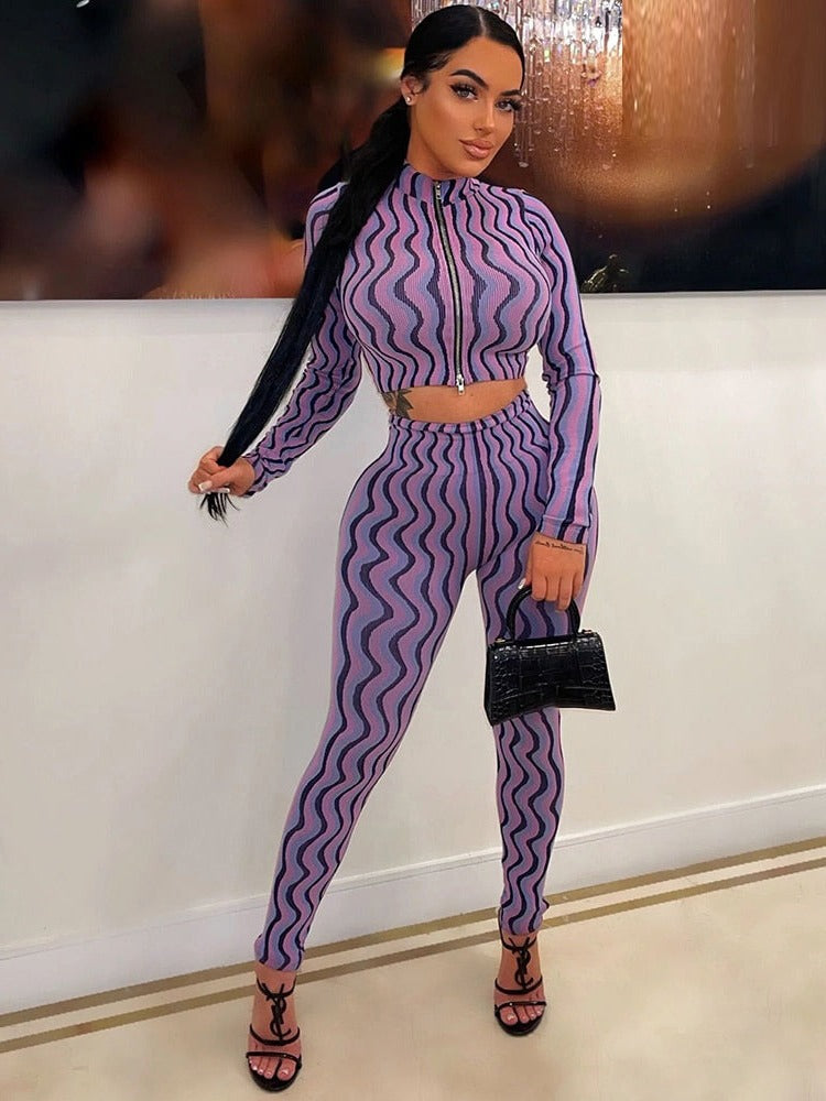 Conjunto de dos piezas con estampado de rayas para mujer, top hipster con cremallera y pantalones ajustados de cintura alta a juego