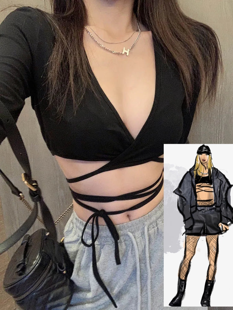 Top corto de verano para mujer, corsé de manga larga, tops Y2k, camiseta sin mangas coreana con lazo en el ombligo, camiseta negra fina, ropa sexy gótica bohemia para mujer