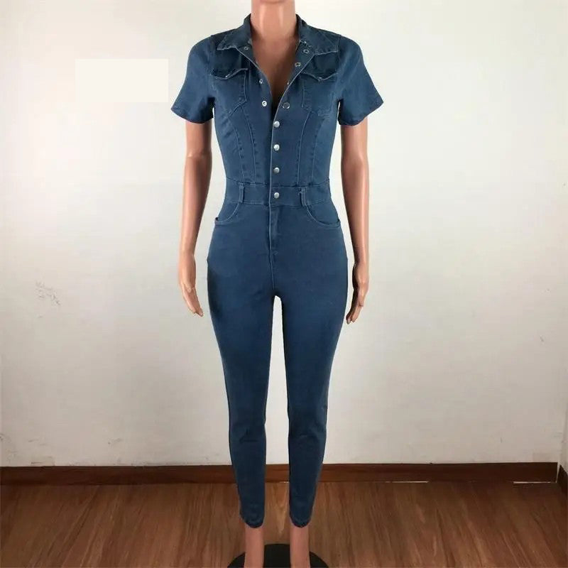Ashore Shop Single Buttons Sexy Denim Jumpsuit Short Women Rompers