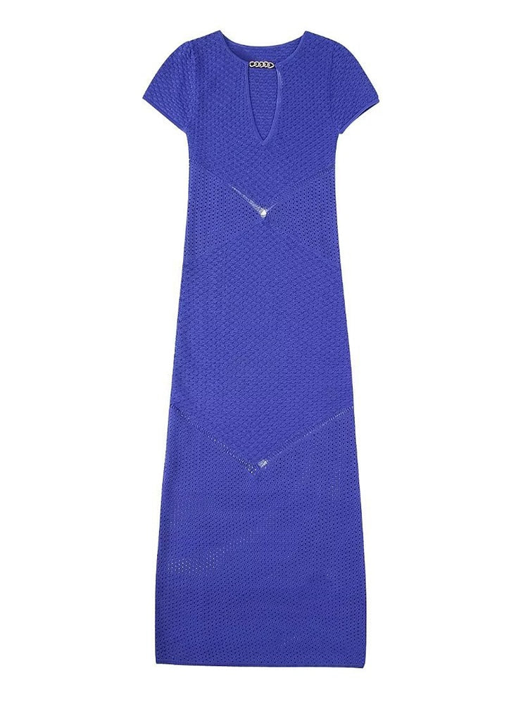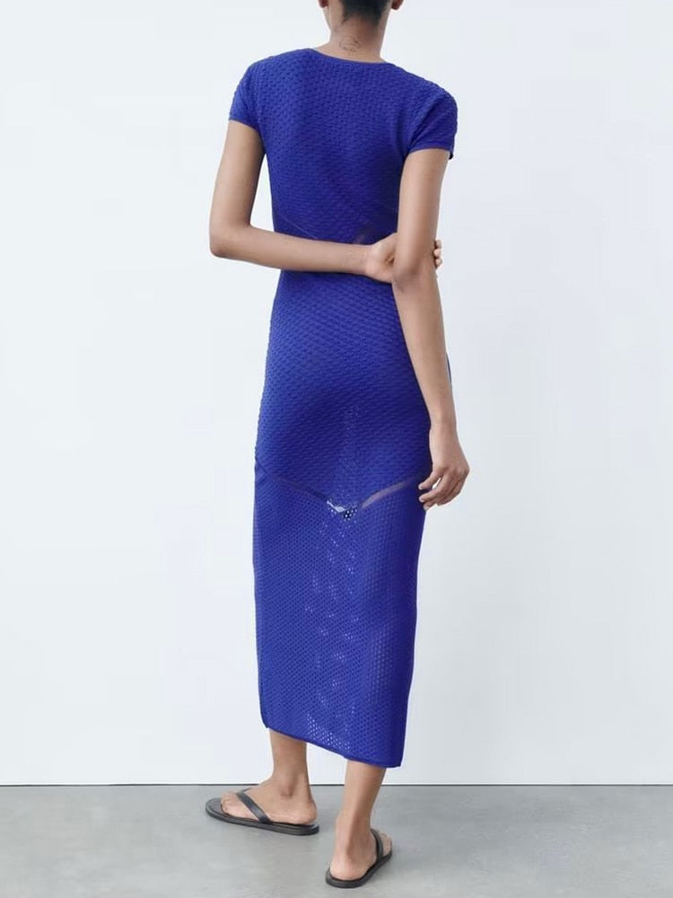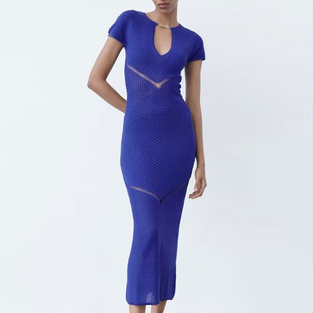 Solid Sheer Dress For Women Round Neck Short Sleeve High Waist Hollow Out Slim Bodycon Dresses Female Summer Clothing New