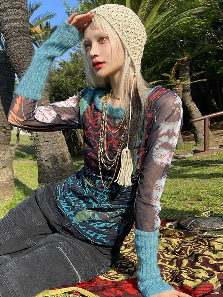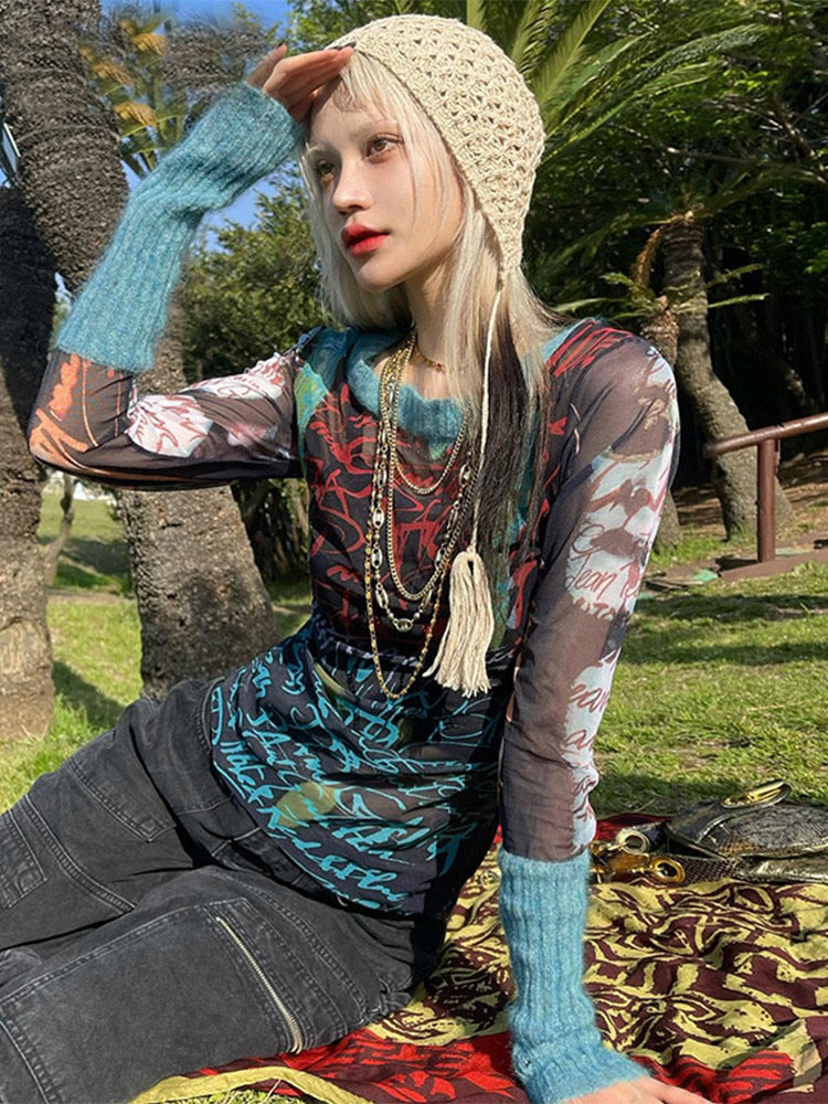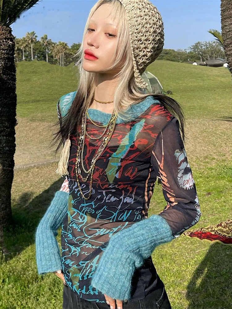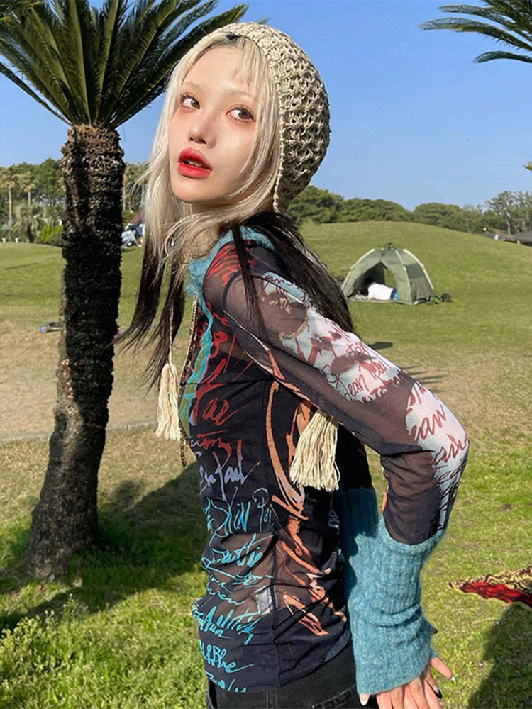 Women Long Sleeve Mesh See Through Streetwear T Shirts Tops Tees