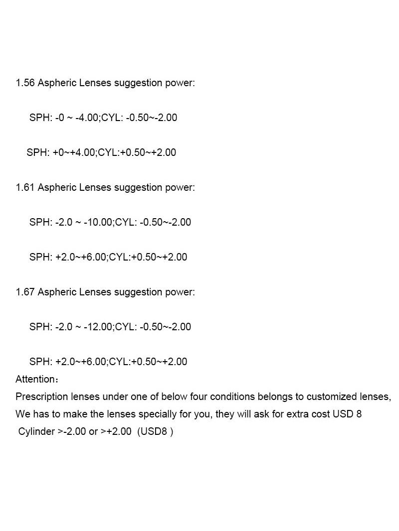 Enhance your vision and protect your eyes with our Aspherical Prescription Glasses, designed to provide clear, comfortable sight for individuals with myopia. These lenses are available in three index options—1.56, 1.61, and 1.67—to suit various prescription strengths and preferences.