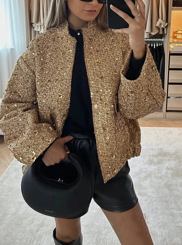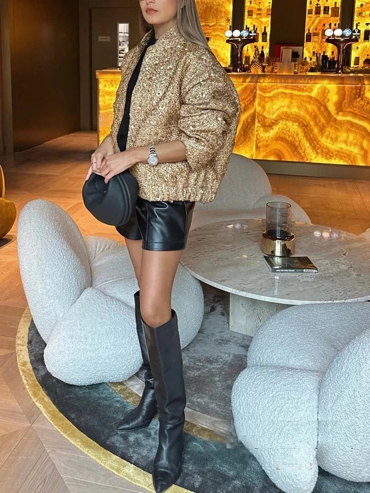 Golden Sequined Oversized Jackets Women Long Sleeve Zipper Jackets