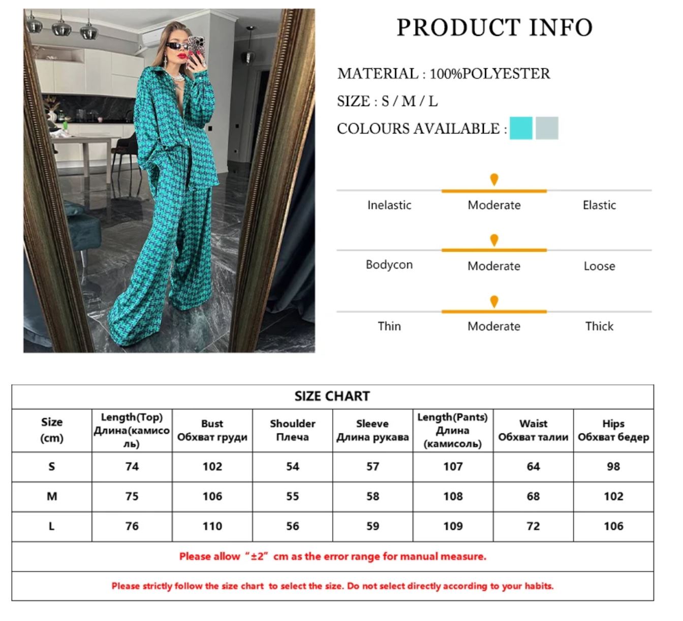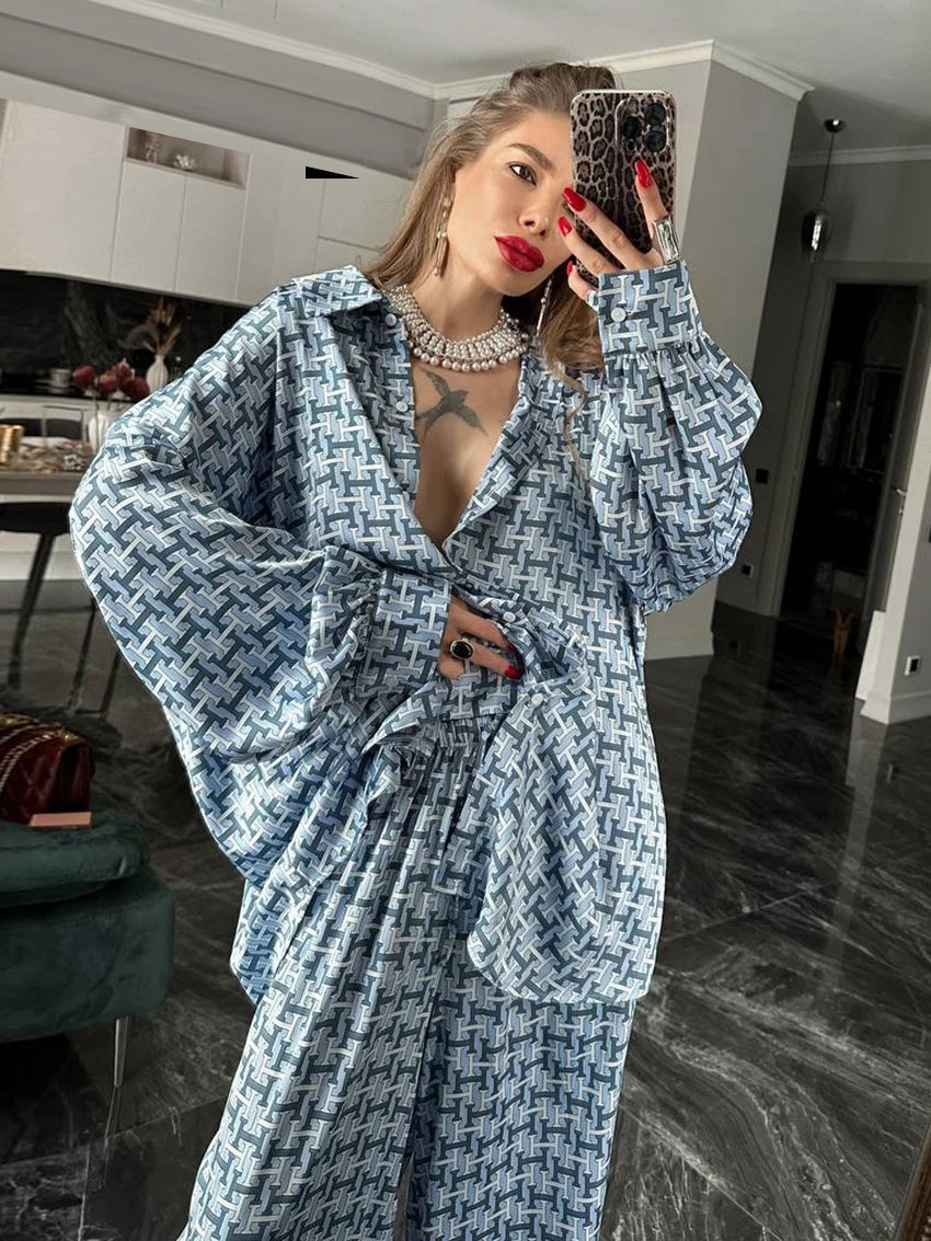Ashore Shop Womens Vacation Casual Outfit Sets Print 2 Piece Sets Women Outfit 2024 Elegant Long Sleeve Shirt With High Waist Wide Pants Set