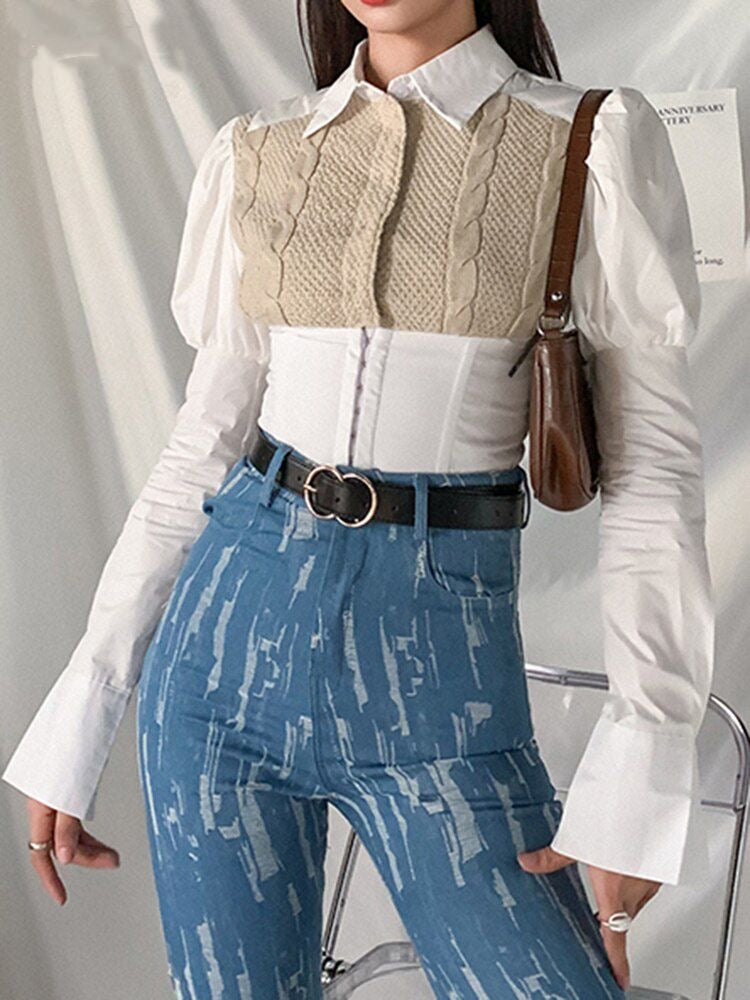 Autumn Womens Blouse Cable Knitted Twist Patchwork Turn-down Collar Shirt