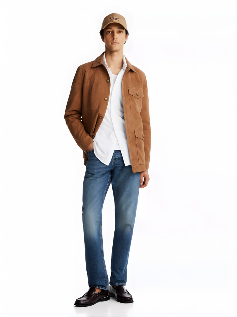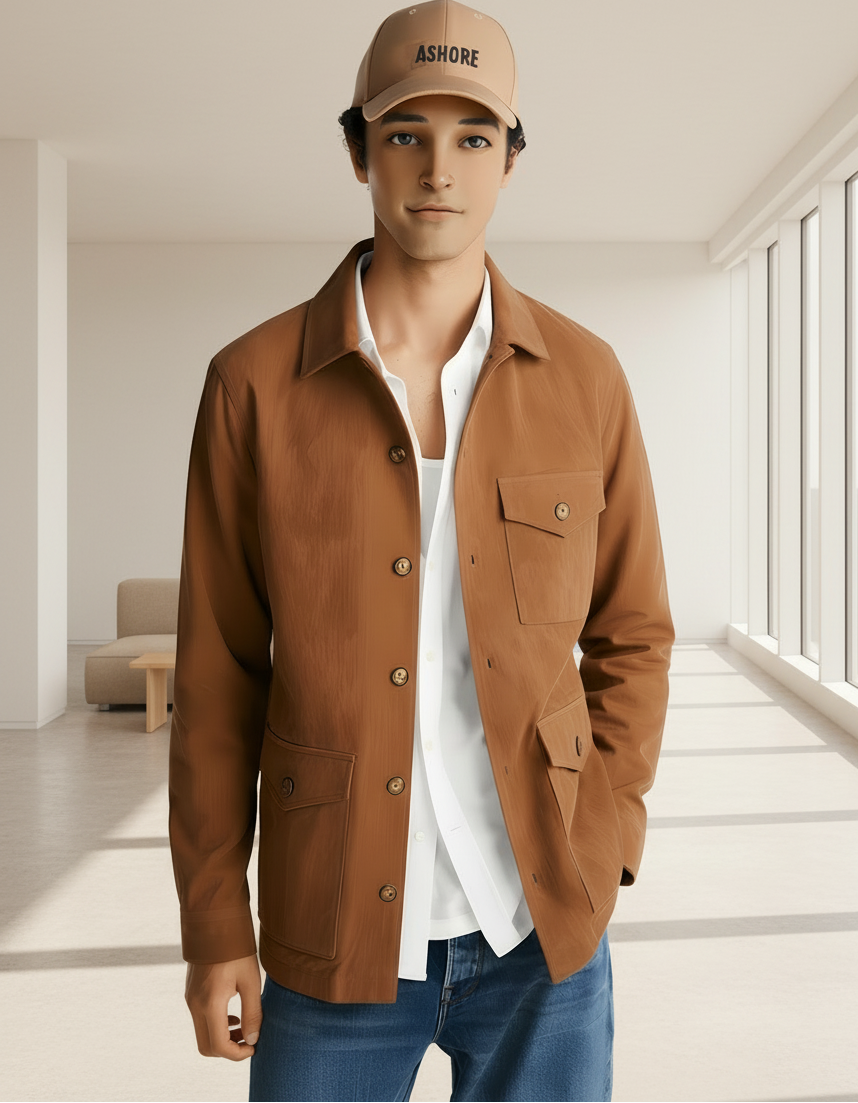 • Ashore Custom Shop men’s suede shirt jacket features a clean, modern design that blends casual ease with refined texture. The soft, matte suede finish gives it a warm and elevated look, while the structured collar and button-front closure add classic shirt-jacket tailoring. Multiple front pockets—including a sleek chest flap pocket and roomy lower pockets—enhance both style and functionality. Its rich brown tone pairs effortlessly with denim or neutral layers, making it a versatile piece for transitional weather or everyday wear. The overall fit is relaxed yet polished, offering a comfortable, stylish outer layer for a wide range of outfits.