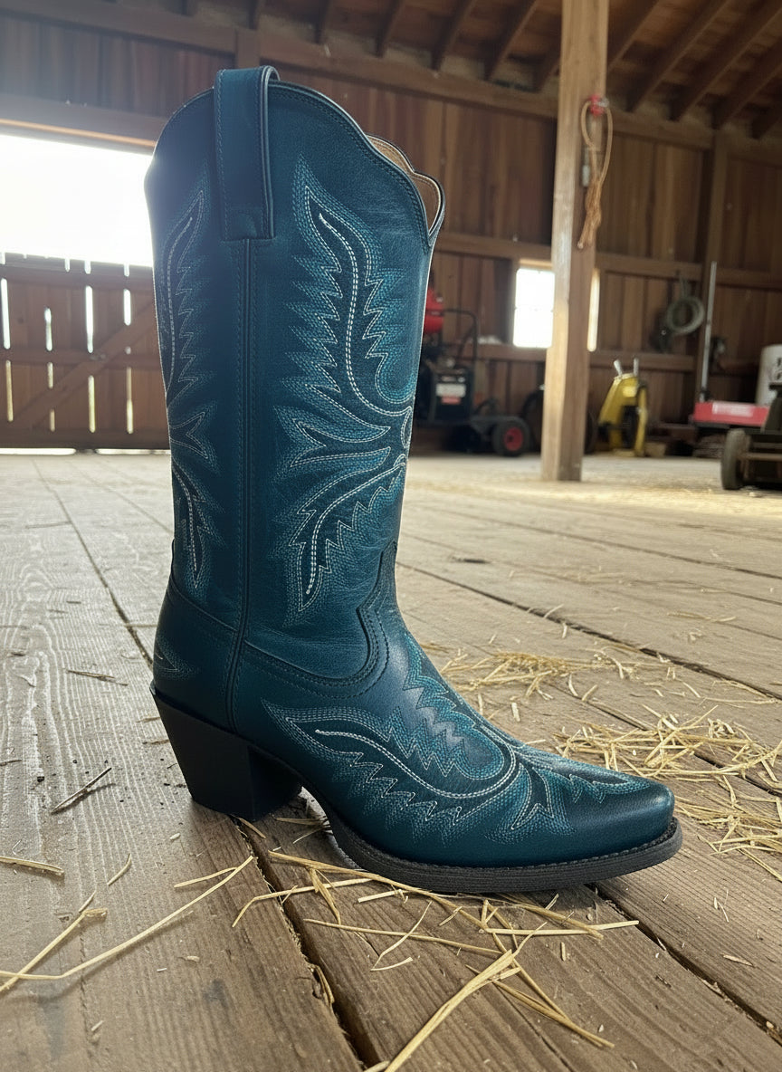 green leather cowgirl boots showcase a classic Western silhouette with a fresh, modern edge. Crafted from smooth, richly toned green leather, they feature intricate contrast stitching along the shaft and foot, forming traditional Western embroidery patterns that add depth and character. The tall shaft includes pull tabs for easy on-and-off wear, while the pointed toe and sturdy stacked heel create an authentic cowgirl profile that’s both flattering and functional. Versatile and eye-catching, these boots pair effortlessly with denim, dresses, or skirts, making them a standout choice for everyday wear or Western-inspired outfits.