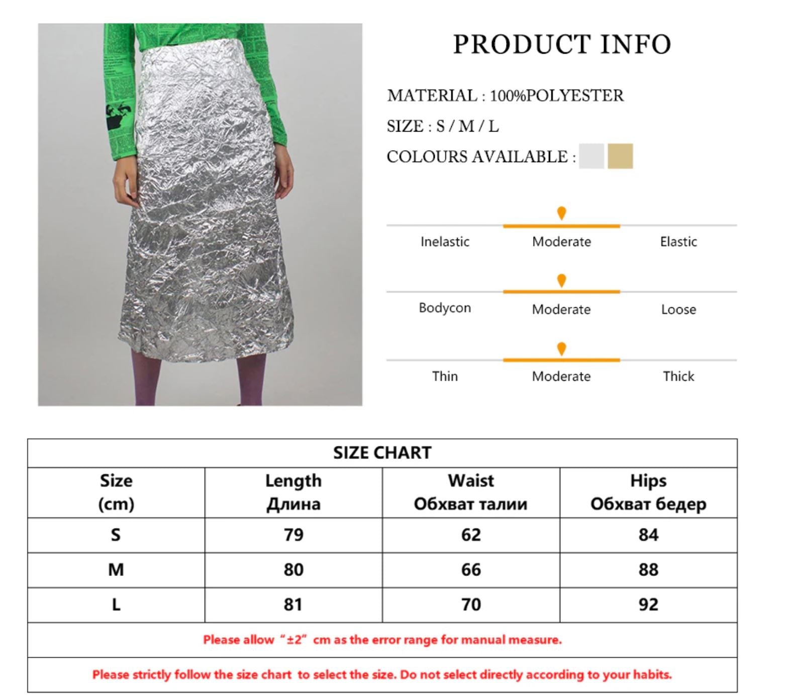 Size Chart of Slim Crushed Gold Women's Skirt Elegant Chic High Waist Midi Skirts