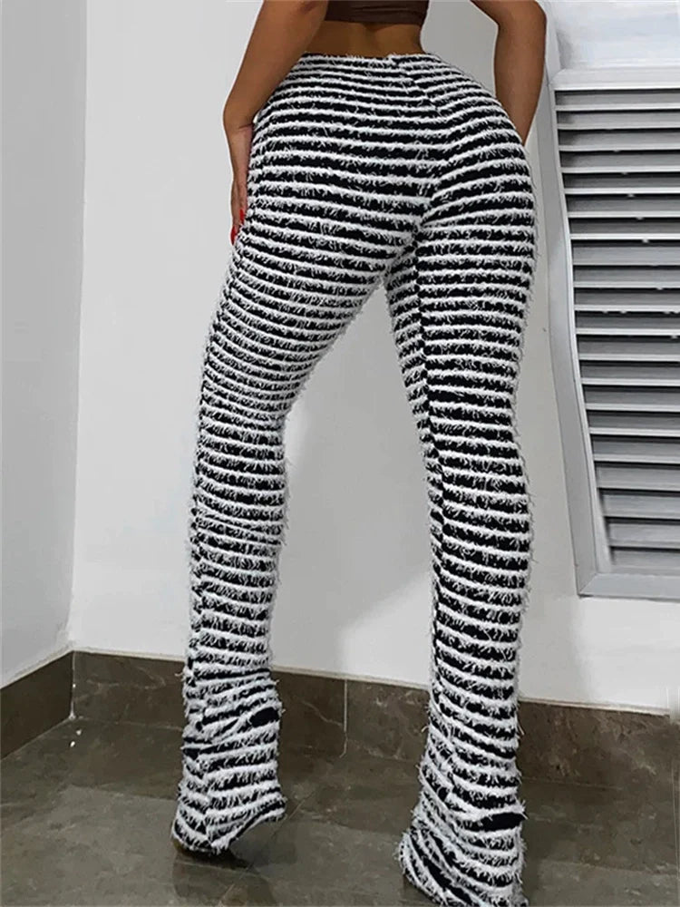 Striped Fluffy Stacked Pants Causal Sporty Leggings Skinny Stretchy Slim Fit Pants
