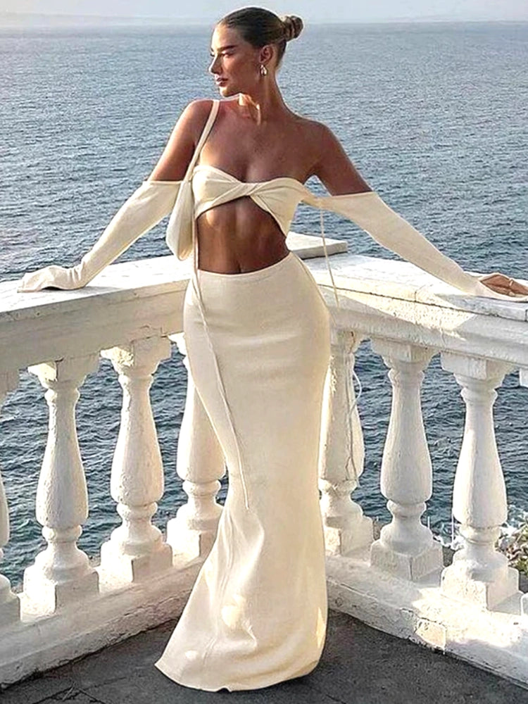 • Ashore Shop Fall Winter long sleeve ladies set low cut crop top skinny hip maxi skirt 2 piece set for women
