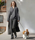 Ashore Innovative Knit loose-fit sweater outfit set — a long cardigan, matching vest, and pants — in soft Knitted fabric. three-piece dark charcoal sweater outfit set exudes effortless sophistication and cozy elegance. It features a loose-fit long cardigan that drapes fluidly, adding relaxed movement and warmth. Underneath, the button-front vest offers a minimalist silhouette with a soft texture, perfectly layered for depth and comfort. The matching loose sweater pants complete the ensemble with a comfortable, elongated fit that maintains the outfit’s refined yet casual tone. Crafted from a plush knit fabric, the set combines texture and tone for a modern monochrome look — ideal for cool-weather walks or relaxed, elevated daywear.