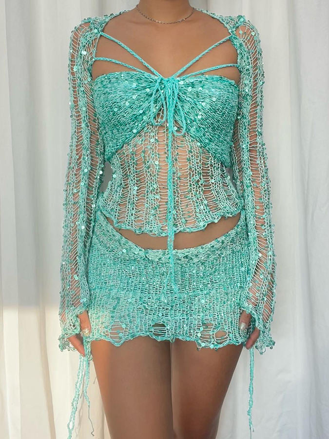 • Ashore Shop Knitted 3pc Sets Summer Knitted Sets Woven Shiny Two Pieces Skirt Sets Solid Bronzing Bandage 2 Piece Set Women Sexy See Through Women's Set