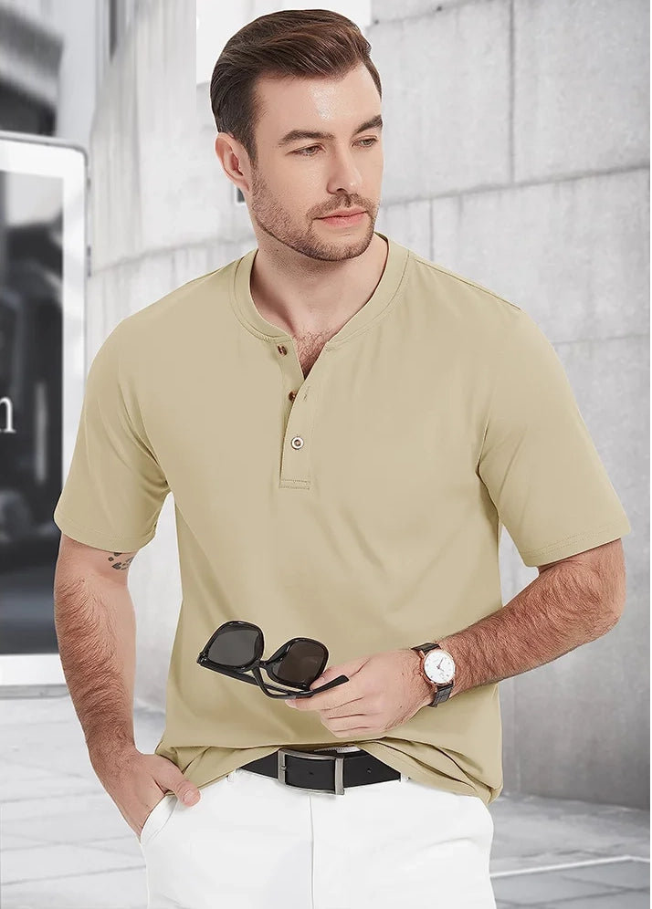 Summer Cotton Henley T-shirts Mens Casual Henry Collar Short Sleeve T Shirts