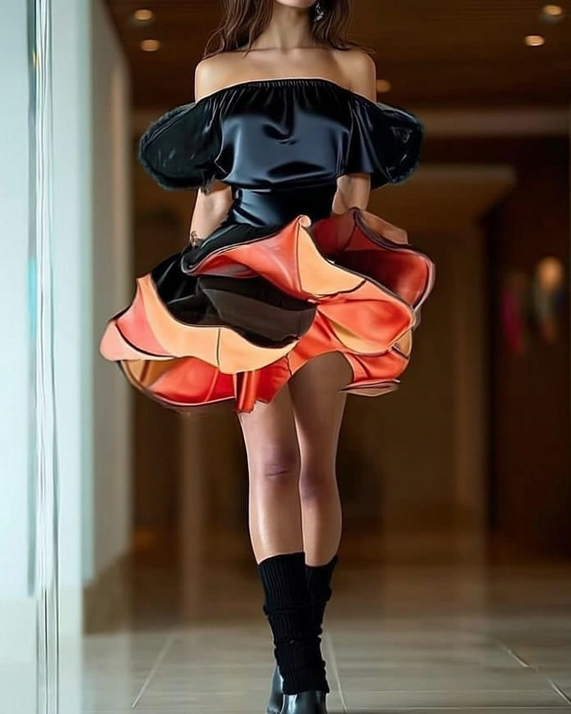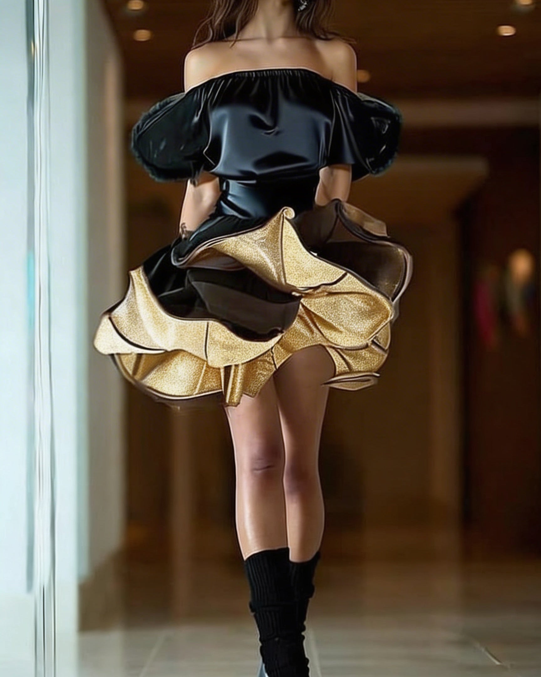 Ashore Custom Shop striking 3D flower petal mini dress is a bold, couture-inspired piece designed to make a memorable entrance at special occasions. The off-the-shoulder bodice features a sleek, satin-like black finish that hugs the upper body with a sculptural elegance, highlighting the neckline and shoulders. Below the waist, the dress transforms into a dramatic, voluminous skirt composed of layered, petal-like structures in shimmering gold and deep brown tones, creating a dynamic, almost blooming effect with every movement. The architectural silhouette blends femininity with avant-garde design, making it perfect for high-fashion events, galas, or statement-making evenings where artistry and sophistication are key.