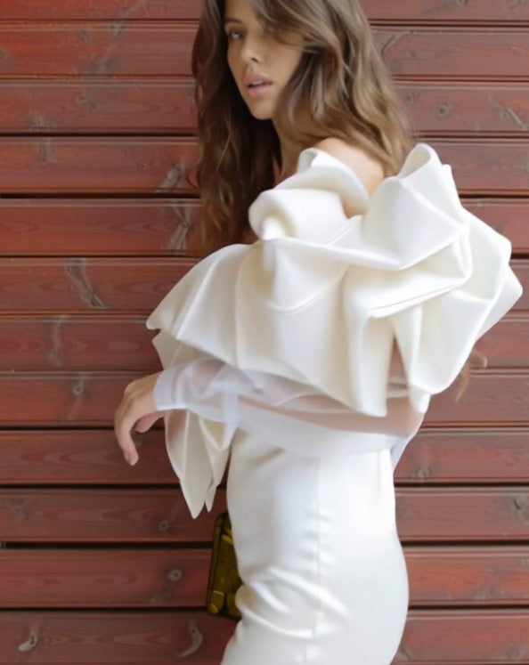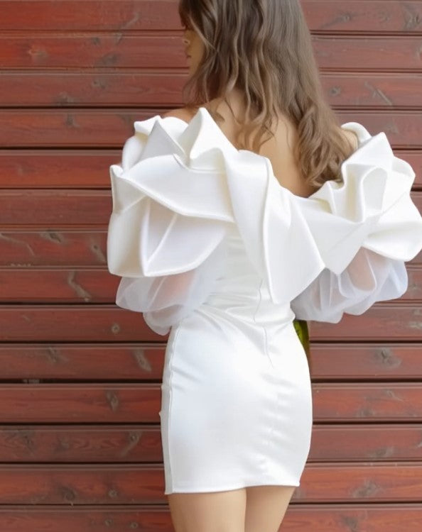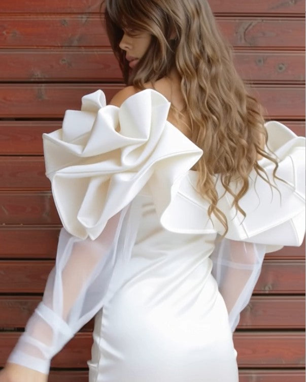 Ashore Custom Shop white or Black 3D flower petal shoulder mini dress is a refined statement piece that blends romantic elegance with modern couture design. The off-the-shoulder neckline is adorned with sculptural, petal-like ruffles that cascade dramatically across the bodice, creating a soft yet architectural silhouette reminiscent of blooming florals. Crafted with a smooth, fitted mini skirt that contours the body, the dress is balanced by sheer, billowy long sleeves that add a touch of lightness and sophistication. The crisp white hue enhances its ethereal appeal, making it an ideal choice for upscale events, bridal celebrations, or exclusive occasions. As a custom-made Ashore designer piece, it offers a unique, tailored fit and an unmistakable sense of luxury and individuality.