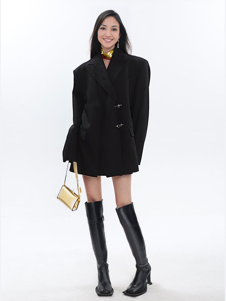 Skirt: A pleated mini design that combines femininity with professionalism, offering movement and style. The high waist provides a flattering shape and pairs beautifully with the blazer.