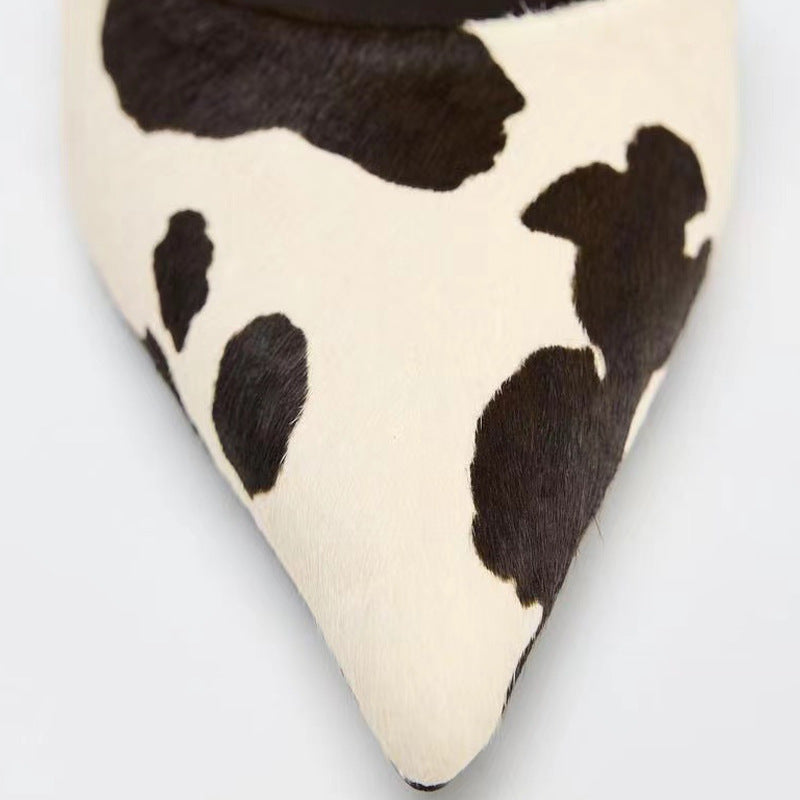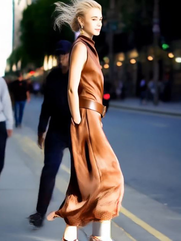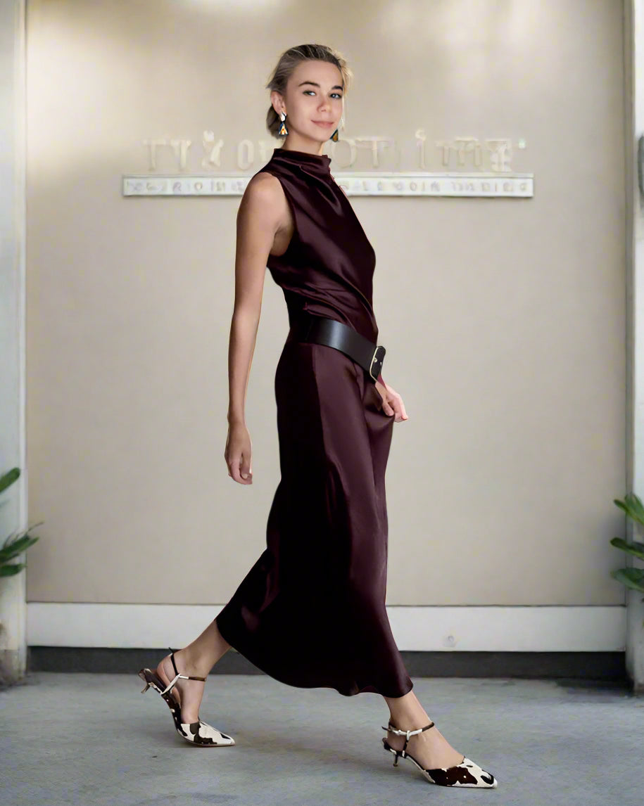 Cinching the waist is a wide brown leather belt with a bold rectangular buckle, offering a touch of structure and contrast to the softness of the satin. The look is elevated with a pair of stylish pointed-toe heels in a cowhide print and statement gold earrings that swing delicately as she moves, blending minimalism with editorial chic.