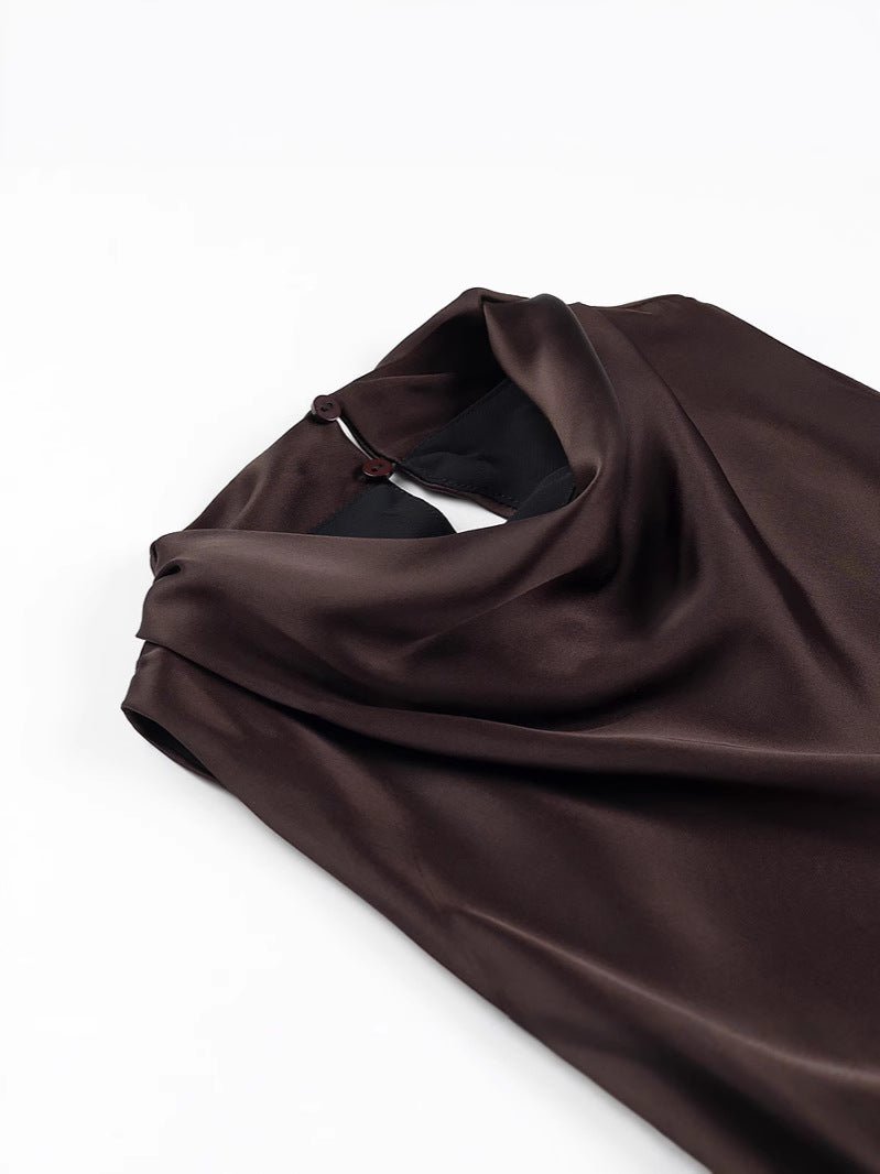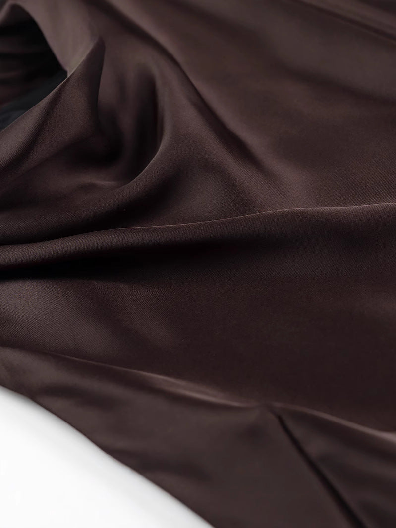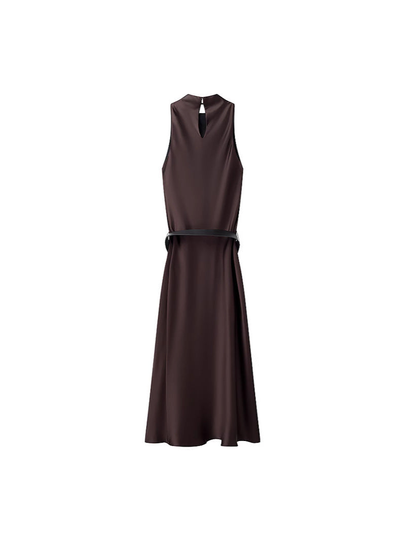 ASHORE Shop refined, sleeveless brown satin dress that drapes fluidly along the body, creating a sleek and elegant silhouette. The fabric has a soft sheen that catches the light, highlighting the smooth texture and rich coffee hue of the dress. A structured high neckline adds a modern, sophisticated touch, while the overall cut flatters the figure with its minimal seams and clean lines.