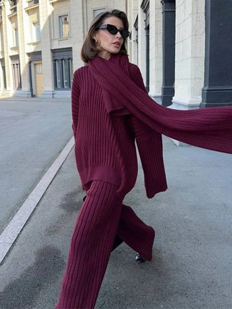 Embrace effortless style and ultimate comfort with this luxurious oversized knitted women’s set. Perfect for the colder months, this set includes a cozy V-neck pullover, long trousers, and an attached scarf, making it the ideal all-in-one ensemble for a chic, laid-back look. The soft, breathable knit fabric ensures warmth without sacrificing style, making it perfect for both casual outings and cozy at-home days.