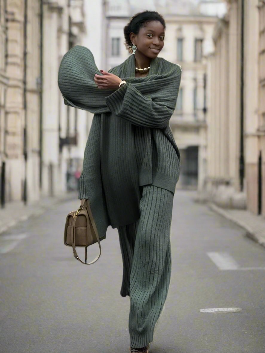 This cozy yet fashionable knit suit is a must-have for your fall and winter wardrobe, bringing both luxury and practicality to your everyday wear.