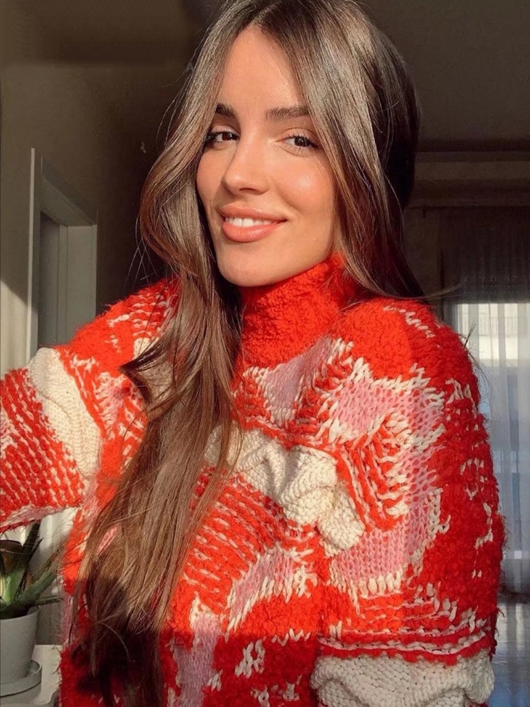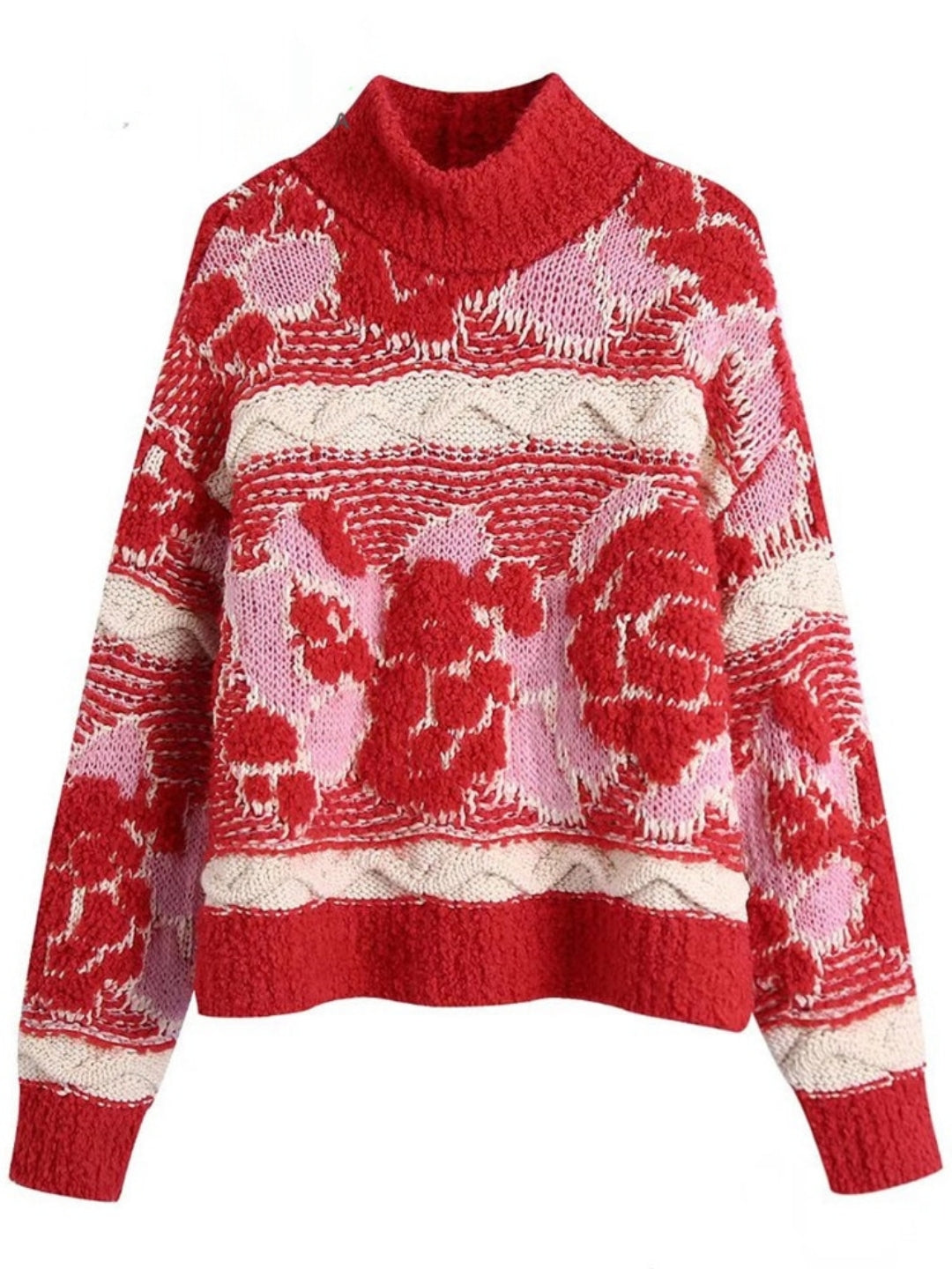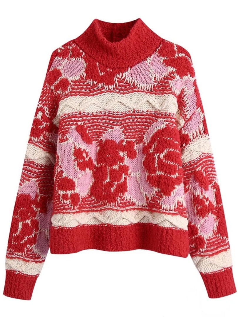 Ashore Sweater Studio Women Winter Jacquard Knitted Short Red Sweater Pullover Loose Sweaters Jumper Turtleneck Long Sleeve Female TopsPattern : Loose-fitting