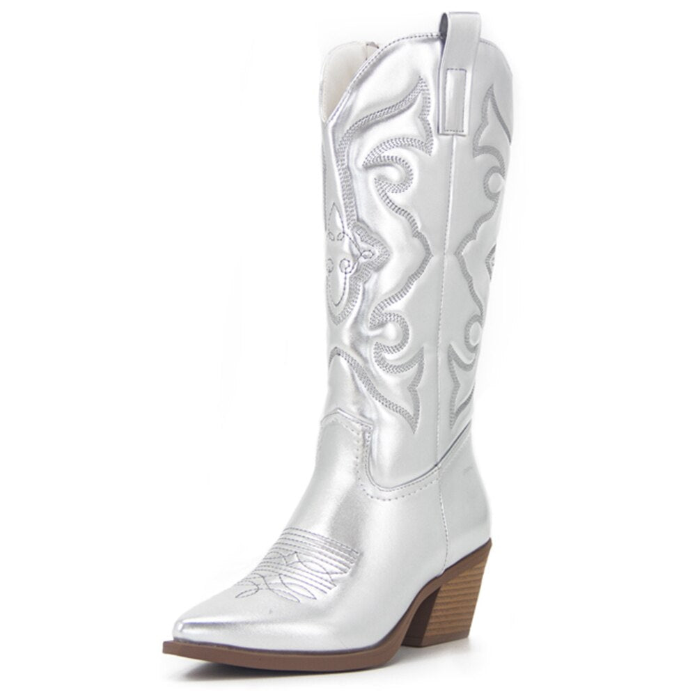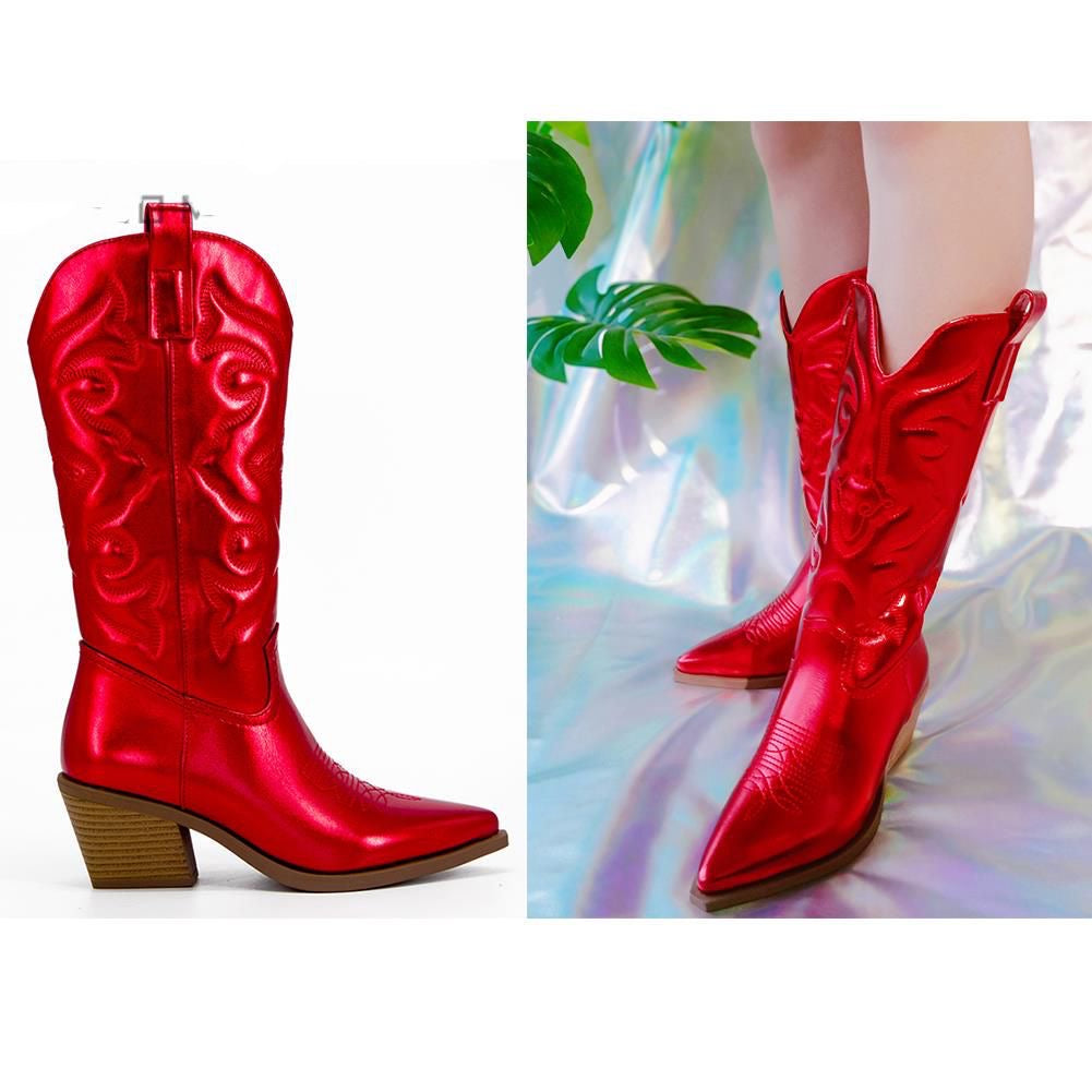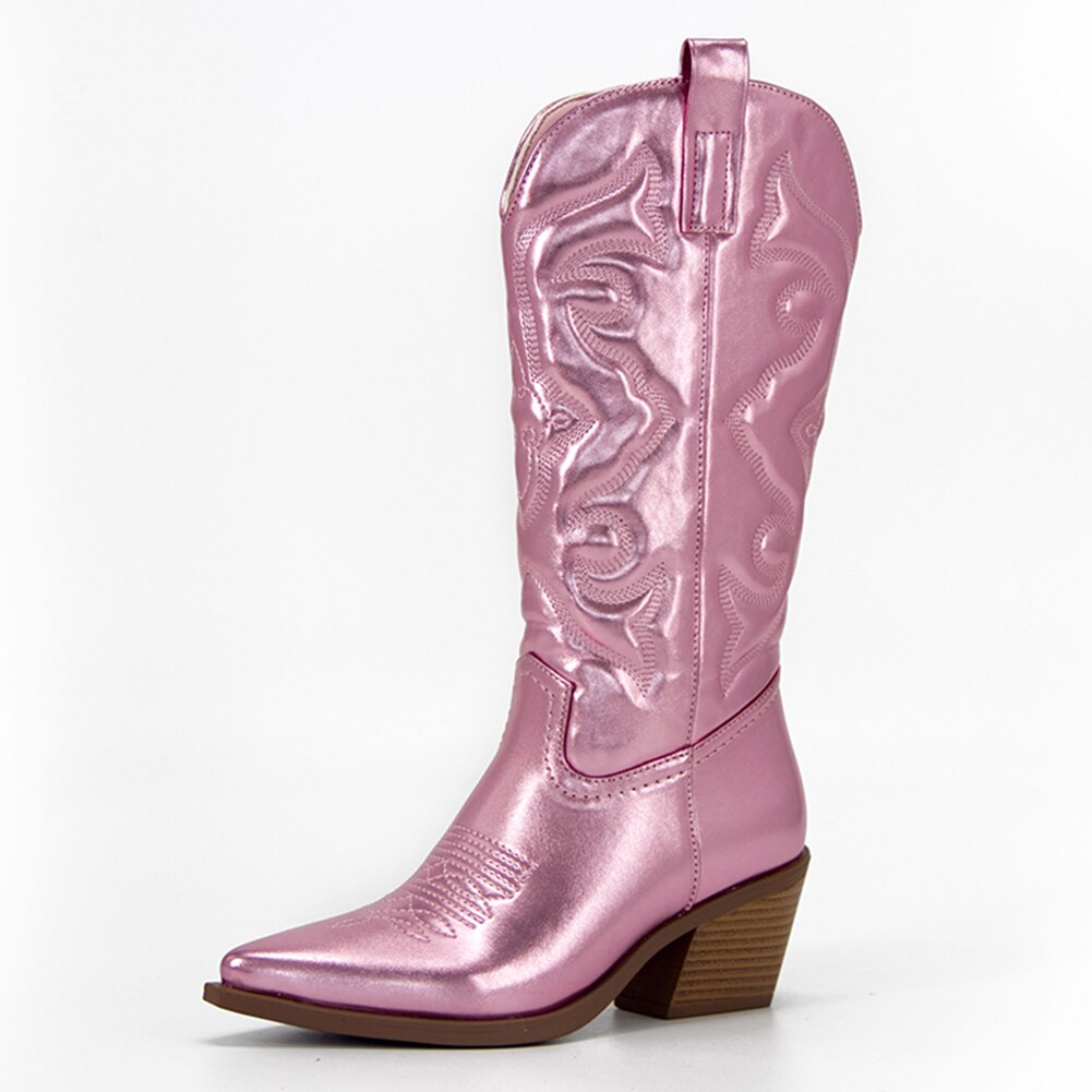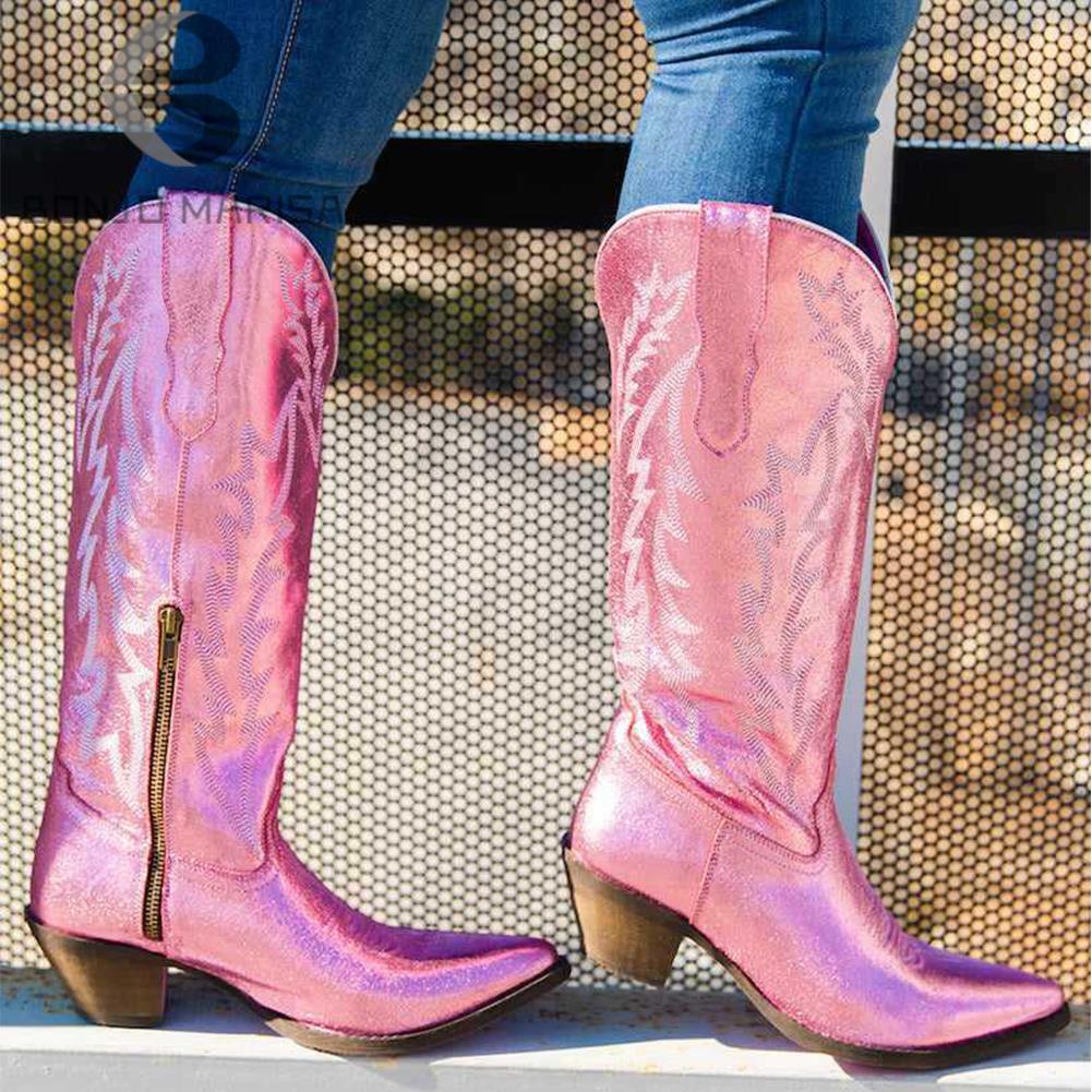 Ashore Western Shop: Hip Cowgirl Boots 2022 Metallic Shiny Pink Cowboy Cowgirl western Boots For Women Zip Embroidered Pointed Toe stacked Heel Mid Calf autumn trendy Boots Shoes