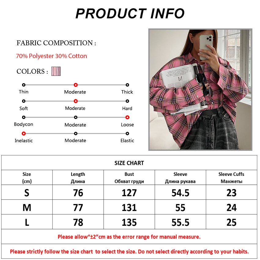 Loose Pink Plaid Shirts And Tops Women Street Wear Gingham Casual Long Sleeve Top Shirts