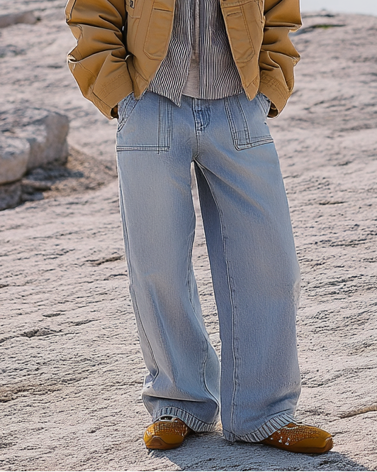 Overall, these jeans combine comfort, functionality, and contemporary fashion, fitting well with casual outfits like sweaters, sneakers, or boots.