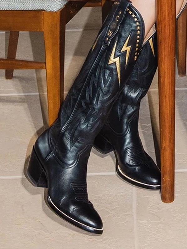 Black Knee High Western Cowboy Boots For Women Embroidered White Pointed Toe Shoes White Wide Calf Cowgirl Boots