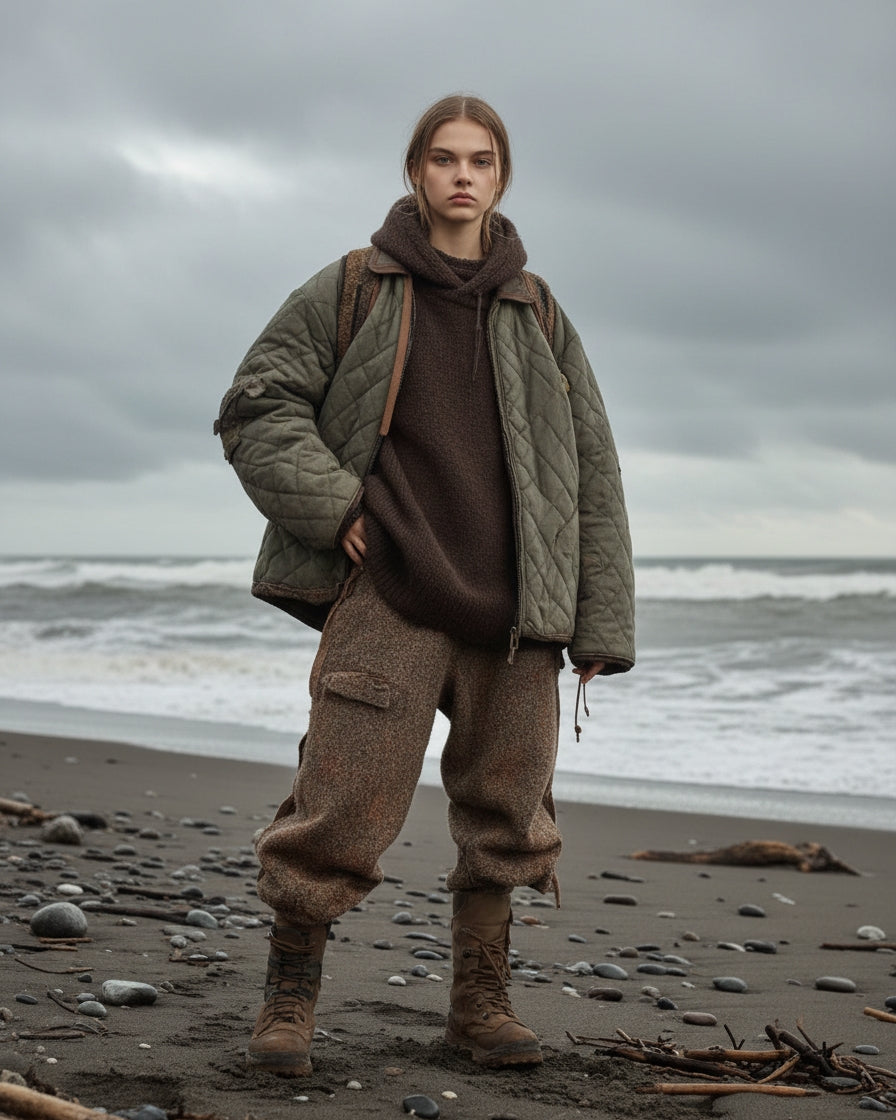 ASHORE Women’s jacket is a quilted, lightweight outerwear piece in a muted olive green tone, featuring a classic diamond-stitched pattern throughout. It has a relaxed, slightly boxy silhouette with dropped shoulders and full-length sleeves for a comfortable fit. The front is secured with snap-button closures, creating a clean and minimal look. A contrasting brown collar adds warmth and visual interest, giving it a subtle heritage-inspired touch. The jacket also includes discreet side pockets seamlessly integrated into the quilting, making it both practical and stylish—ideal for transitional weather and casual layering.