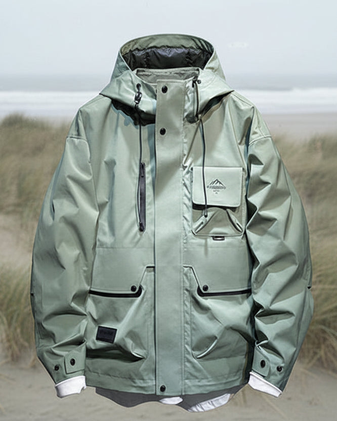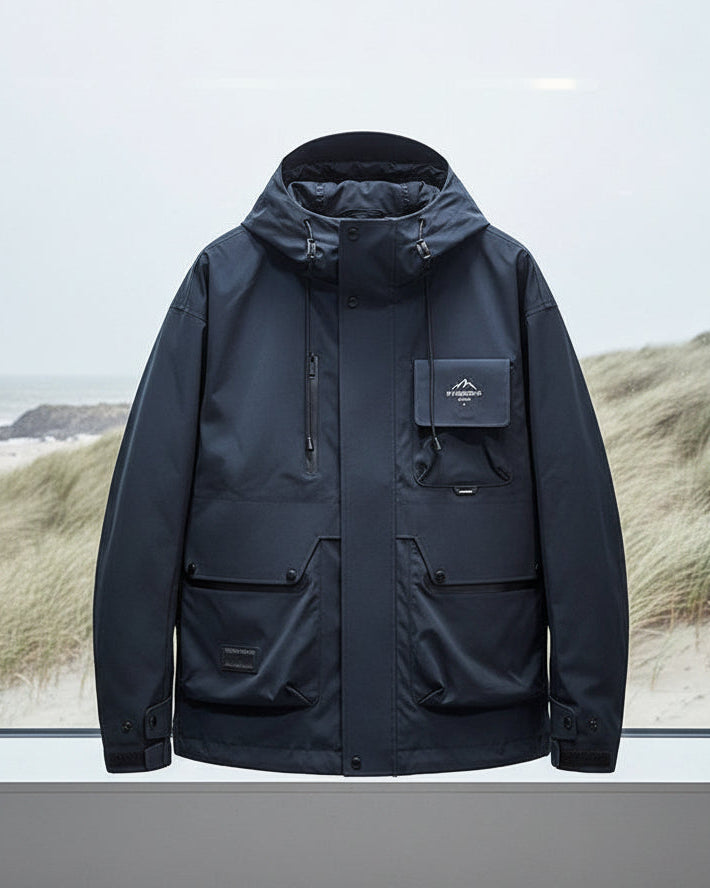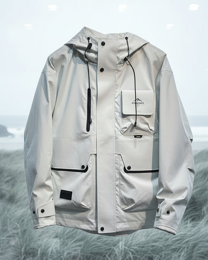 unisex hooded jacket features a rugged yet refined outdoor jacket in a versatile muted White/Khaki/Green/navy tone, perfectly suited for coastal or transitional weather. Crafted from a durable, matte-finish synthetic fabric that appears wind-proof and lightly water-proof, it features a structured adjustable hood with drawstrings and brim, a full front zipper concealed behind a snap storm placket for added protection, and articulated sleeves ending in snap or adjustable cuffs with subtle white contrast lining. Practicality shines through its multiple storage solutions, including large flap-secured cargo pockets at the lower front, a prominent chest patch pocket adorned with a mountain/peak logo emblem (suggesting an outdoor or adventure-focused brand), and additional utility details. The relaxed, boxy fit allows easy layering, while black hardware accents, drawcords at the hood and hem, and reinforced stitching contribute to a modern techwear-meets-classic-utility aesthetic—ideal for beach strolls, light hikes, or everyday urban exploration in variable conditions,