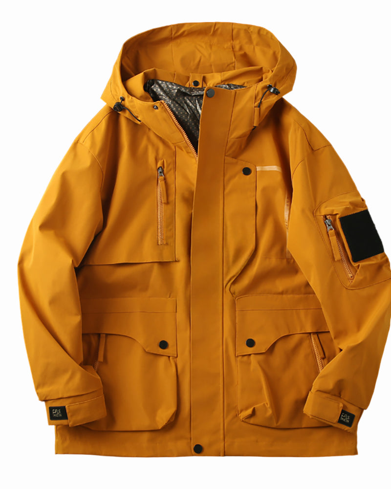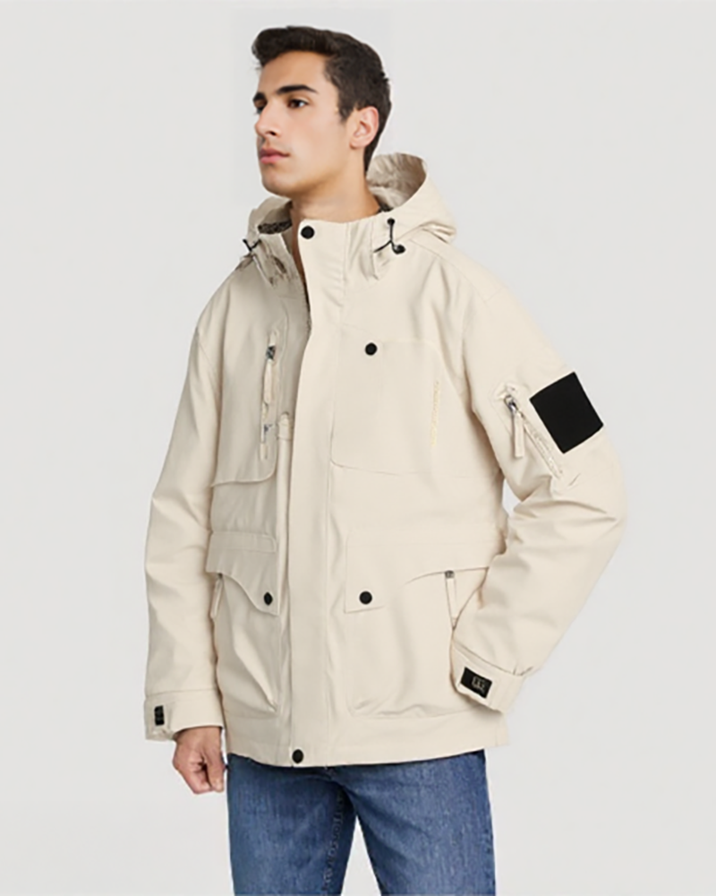 Ashore Shop men's midweight waterproof jacket is a practical and stylish piece, designed for mild to moderate weather. Featuring a lightweight yet durable construction, it offers protection from rain while maintaining comfort. The jacket includes a hood for extra coverage, adjustable to fit snugly, and several functional pockets, including a zipper pocket on the upper sleeve and buttoned pockets on the front for easy storage. The neutral beige color gives it a sleek, versatile look, ideal for both casual outings and outdoor activities. A subtle logo patch on the sleeve adds a modern touch without overwhelming the design. This jacket is the perfect balance of functionality and style.