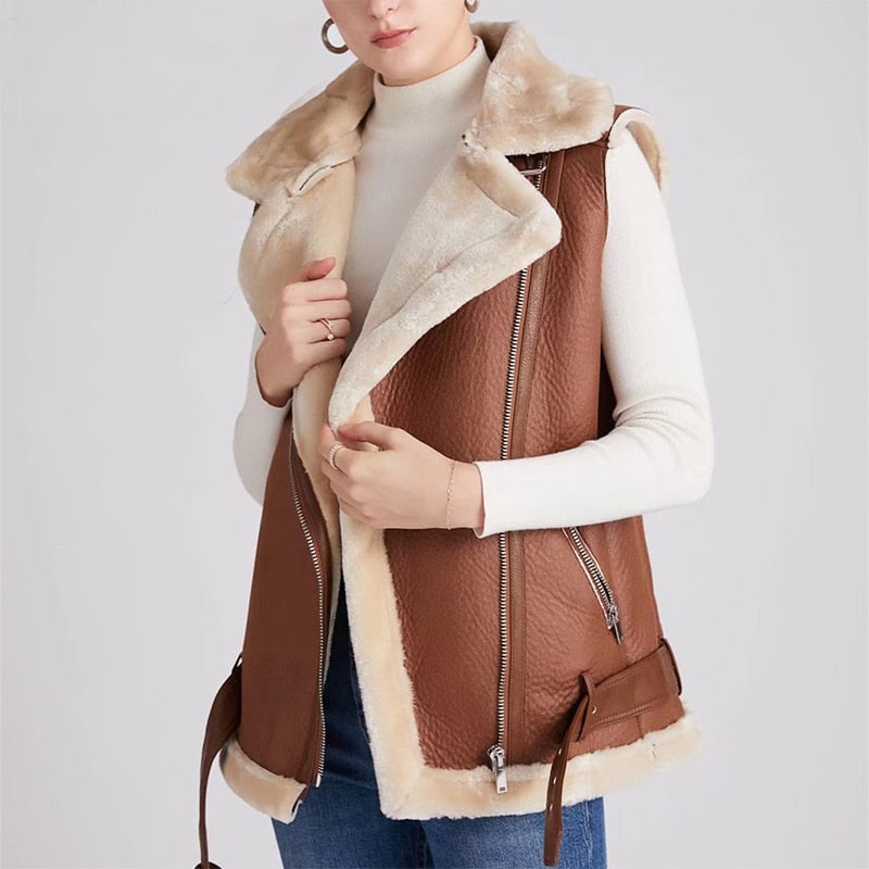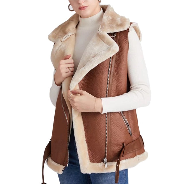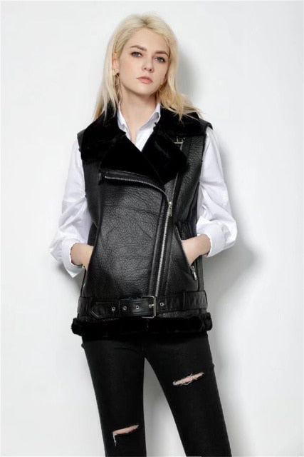 Slim Women Faux Leather Fur Vest Jacket Winter2021Retro Streetwear Buckle Belt Fashion Solid Warm Burrs Female Chic Outwear