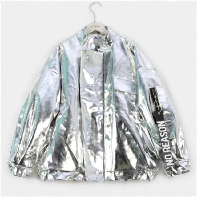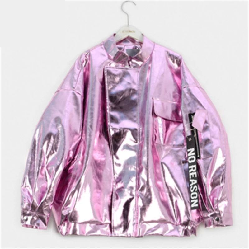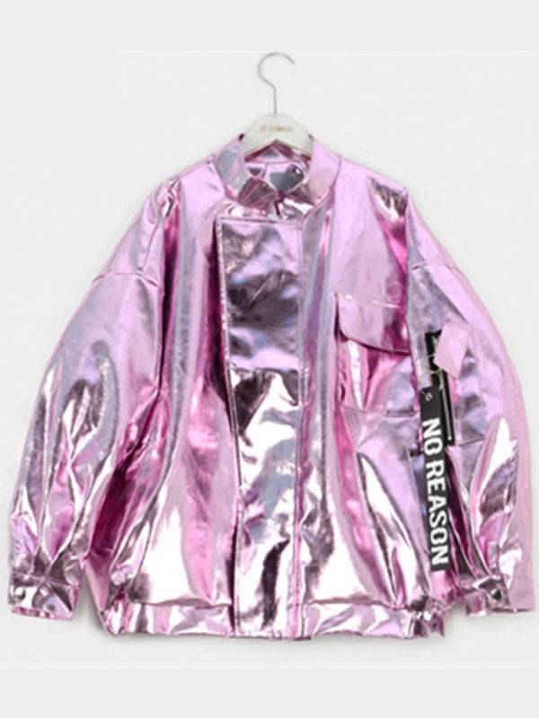 Womens Street Loose Metal Color Pink Purple Silver Stand Neck Coat Party Jacket