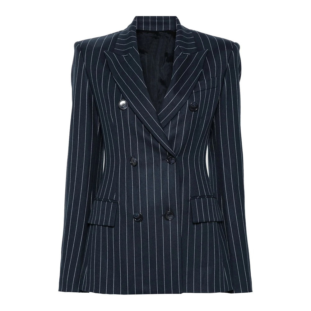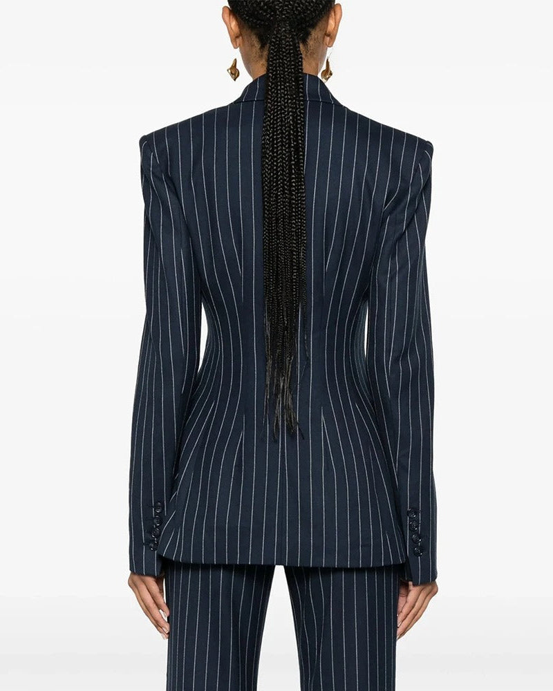 • Color/Pattern: A timeless black and white pinstripe pattern, where vertical stripes run uniformly across the jacket, adding an elegant and elongating effect to the silhouette.