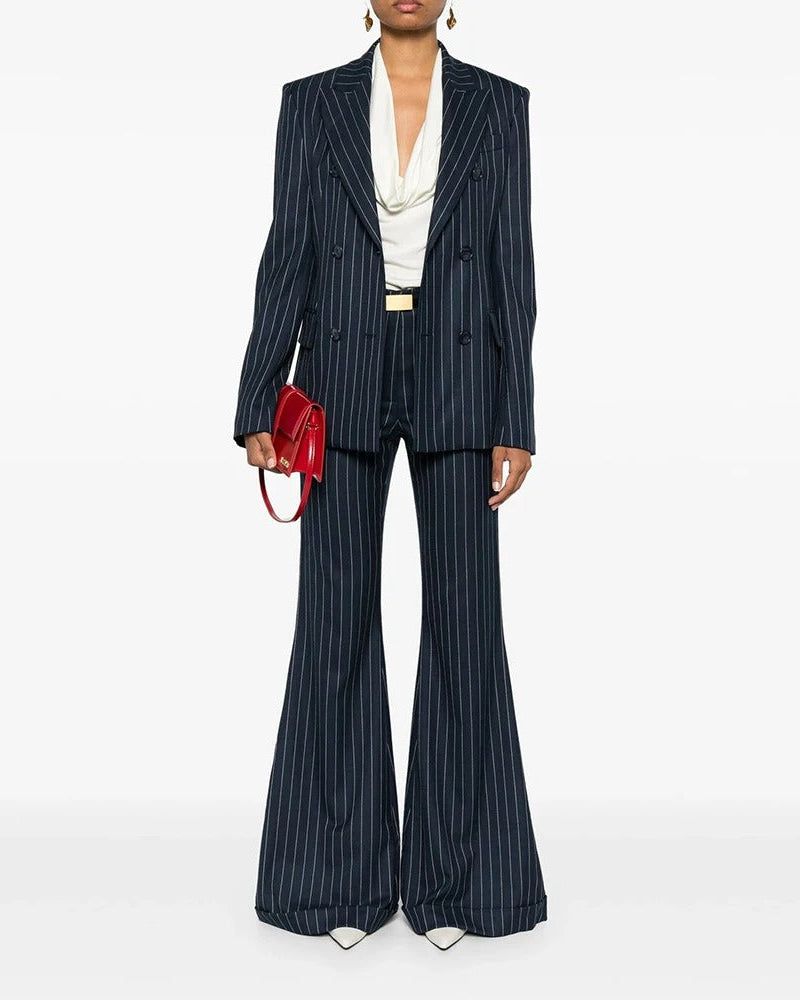 • Mid to High Rise: The pants would have a mid-to-high rise waist, giving them a sleek, flattering shape and allowing them to pair well with the double-breasted jacket.