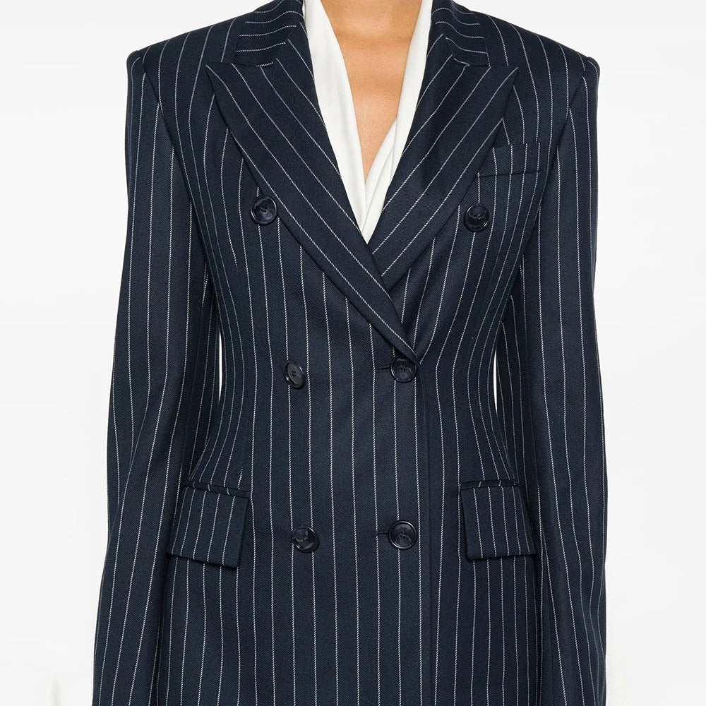 This suit would exude a classic yet modern vibe, combining traditional pinstripes with sharp tailoring and contemporary touches like peak lapels and a double-breasted fastening. It would be a power suit perfect for professional settings, business meetings, or formal events where a sleek, sophisticated appearance is desired. You can complete the look with a crisp, white blouse or a fitted top, paired with high heels for an added sense of height and elegance.