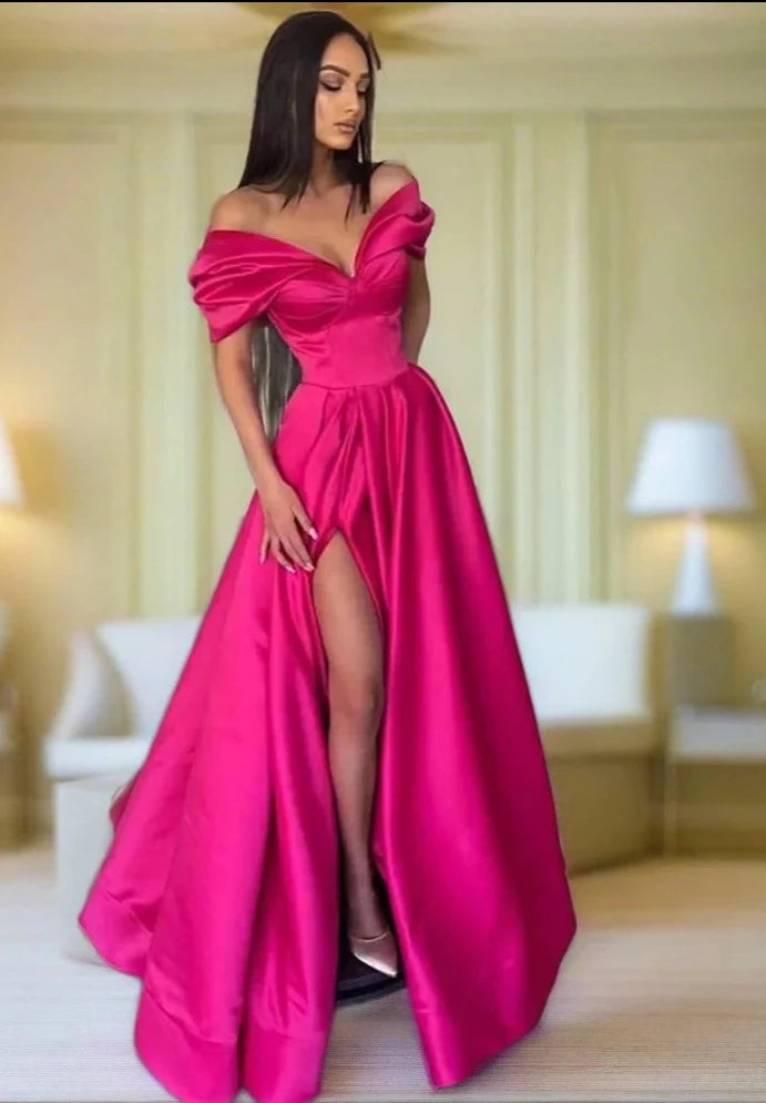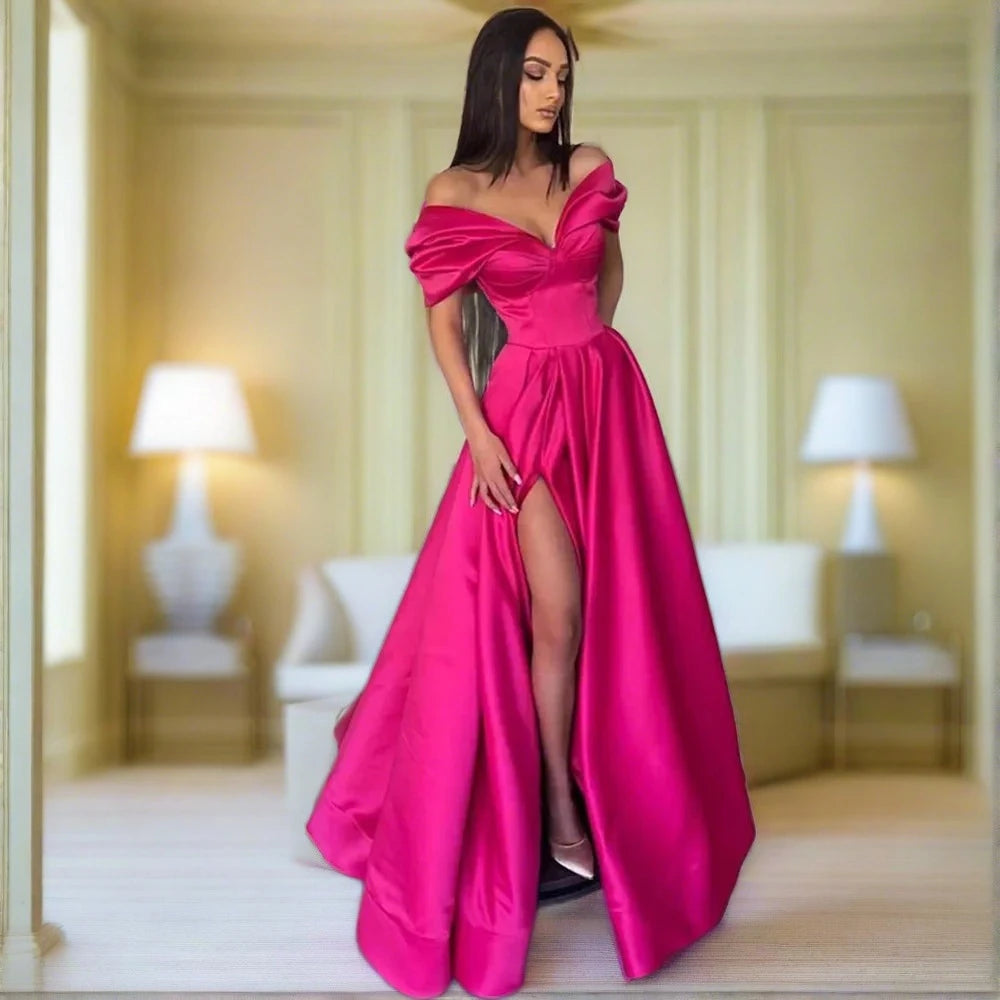 Elegant Pleats Prom Gown Maxi Dresses Satin Side Slit Evening Dress Off the Shoulder Party Prom Dresses For Women Formal robes de soirée